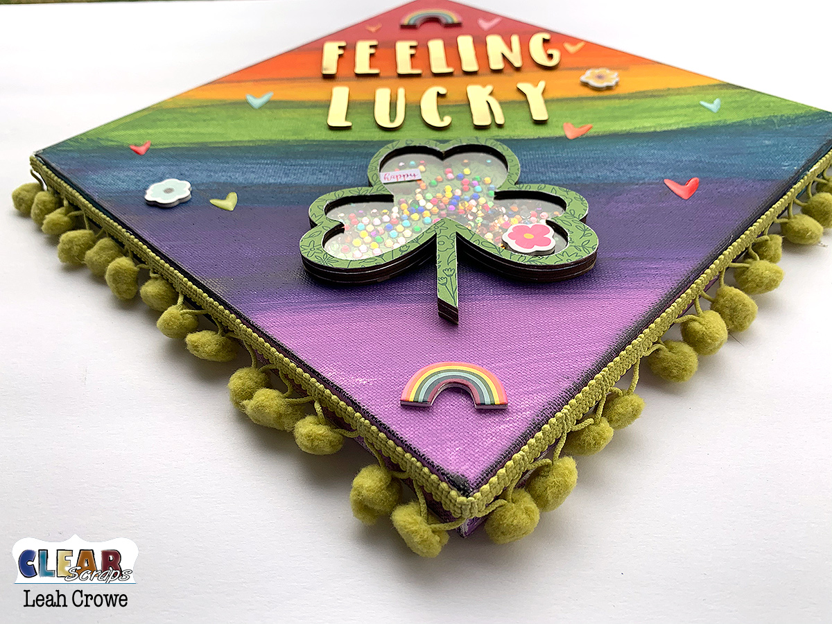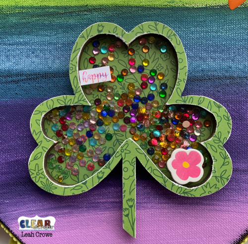 I adhered pattern paper to the top and bottom layer of chipboard then filled the shamrock with little rhinestones.
