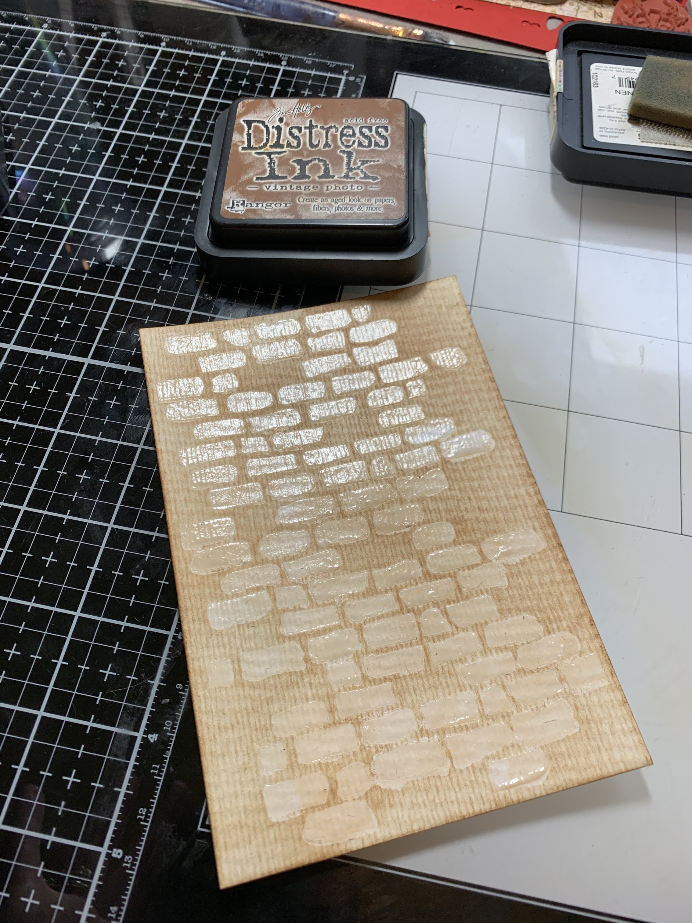 Once dry, layer distress inks over bricks. The ink will wipe ripe off the bricks ! Mat onto black card stock and add to patterned paper.