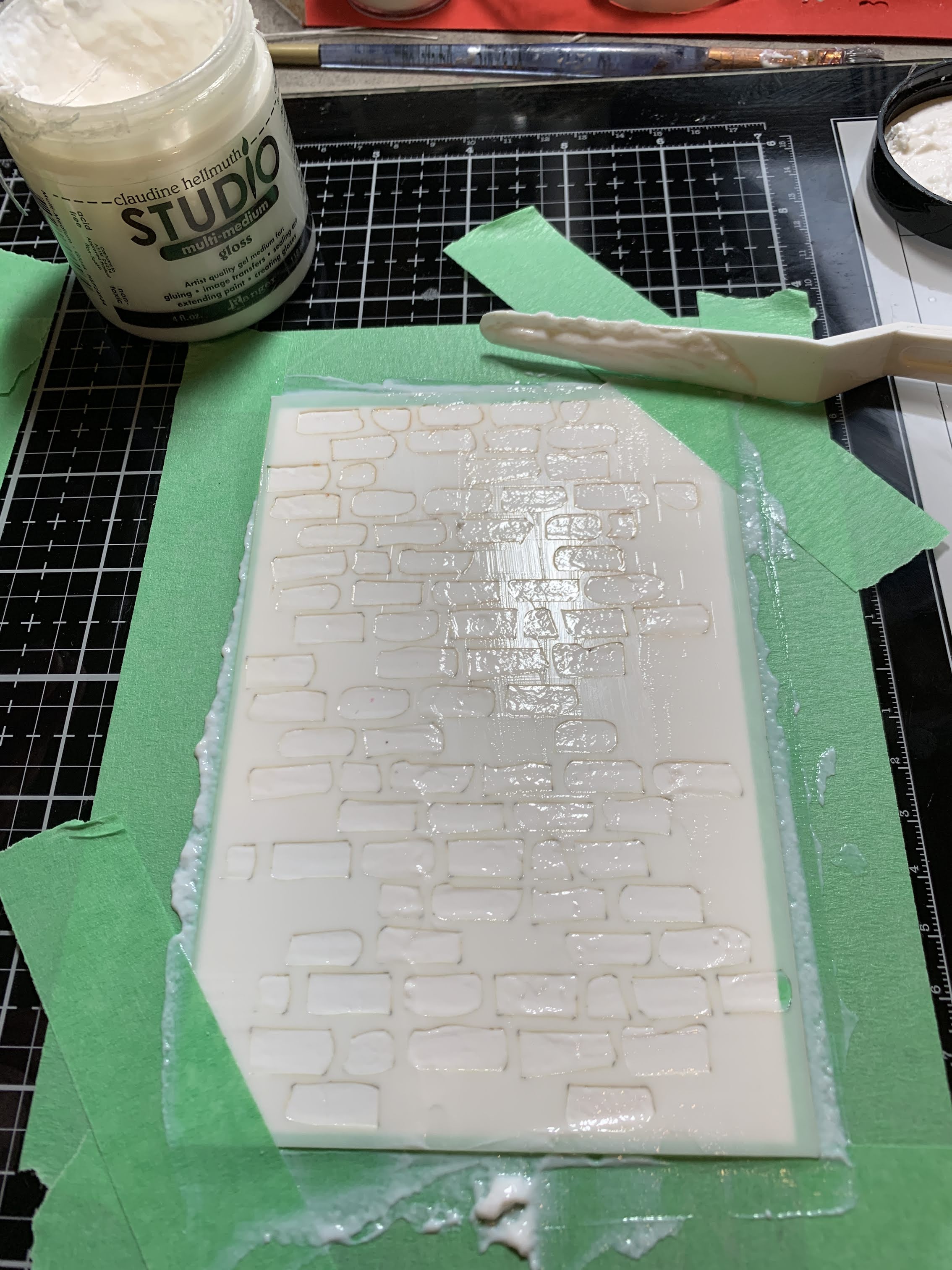 Apply the Multi Media Gloss over stencil. Remove and let dry. (clean your stencil with a bit of soap and water.)