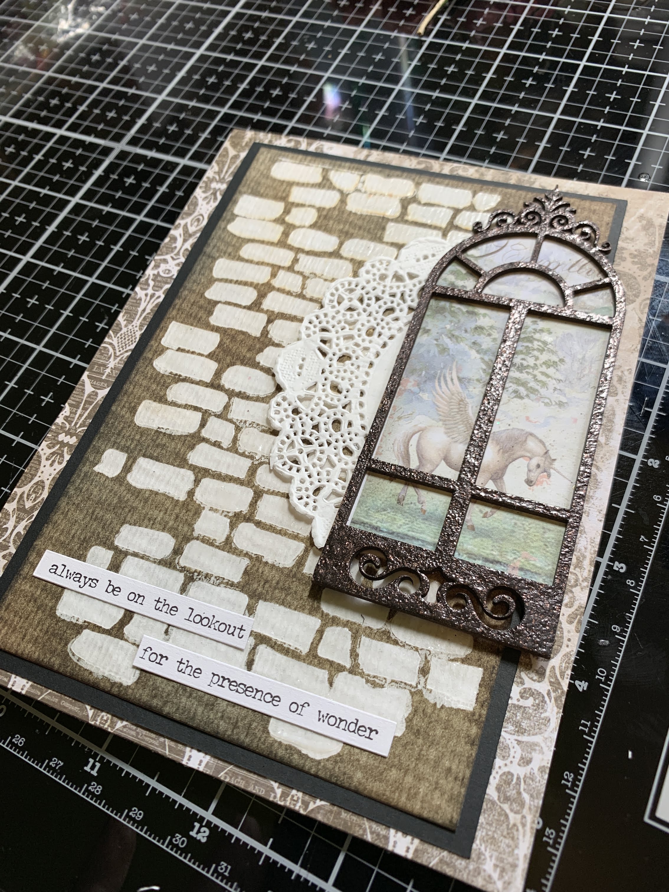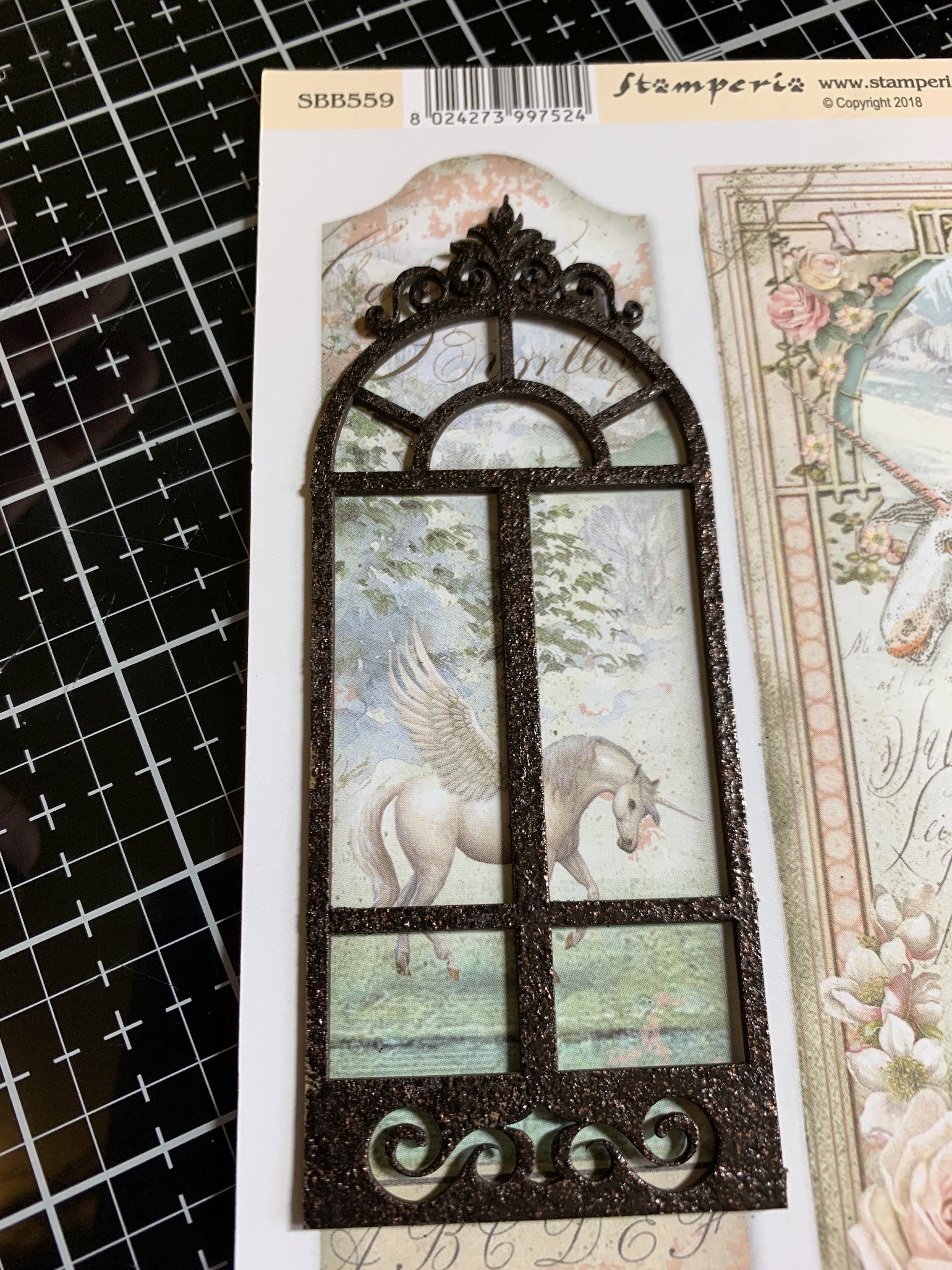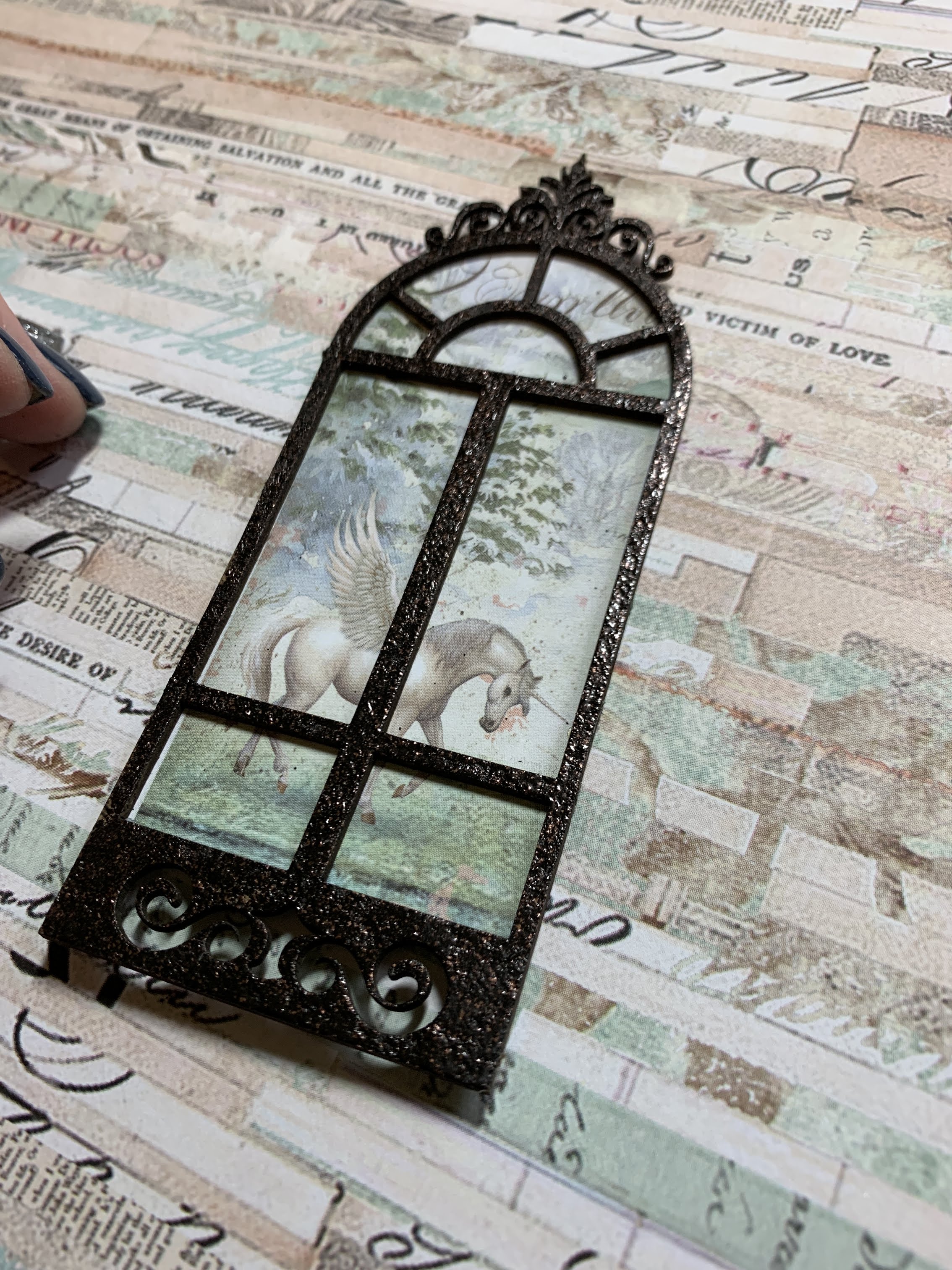Lay embossed window over patterned paper to frame image and trace. Cut image and adhere to window.