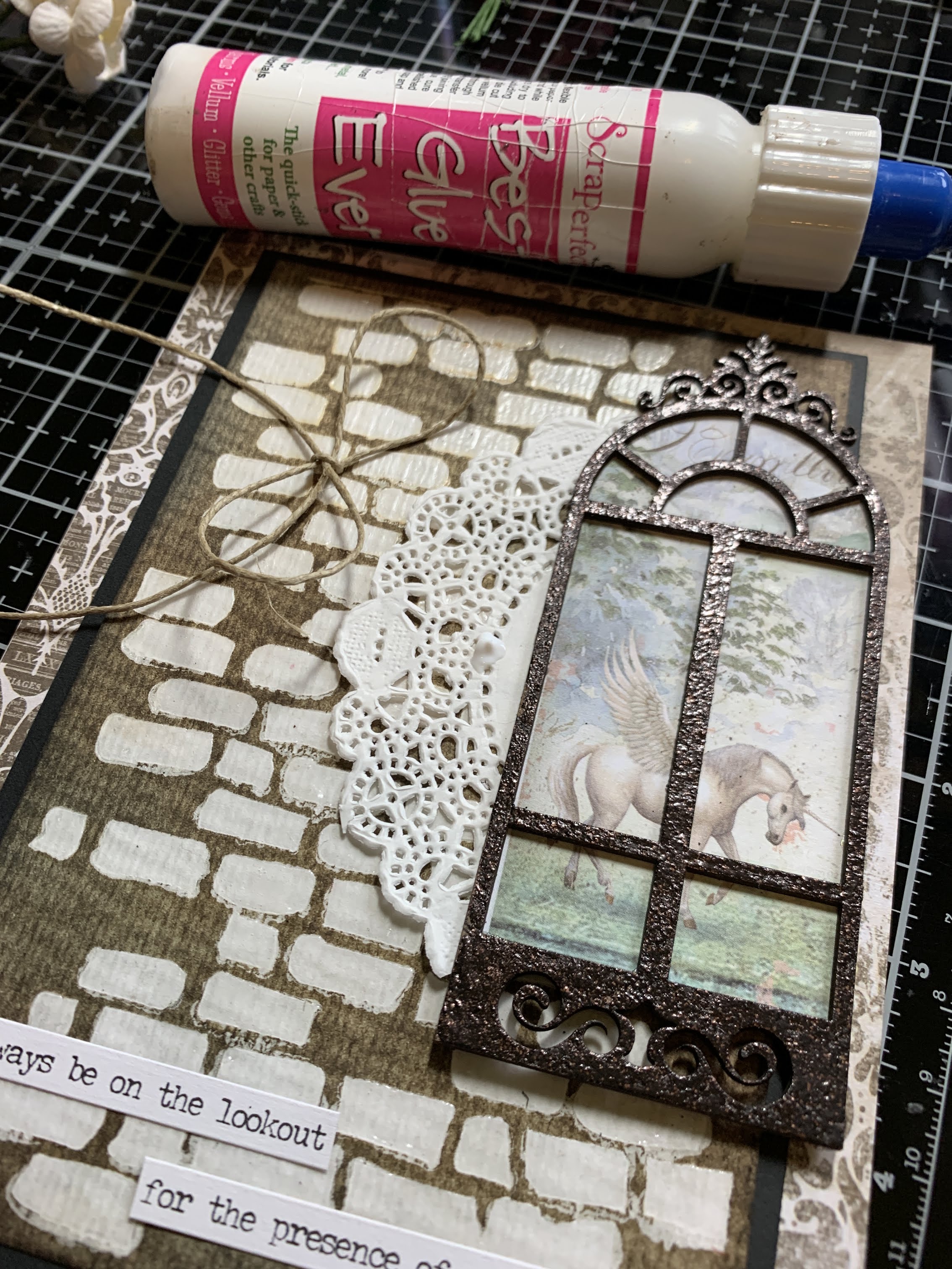 Add window to card, I layered a paper doily under the window to add extra dimension. Add bow and flower and sticker sentiments to finish!