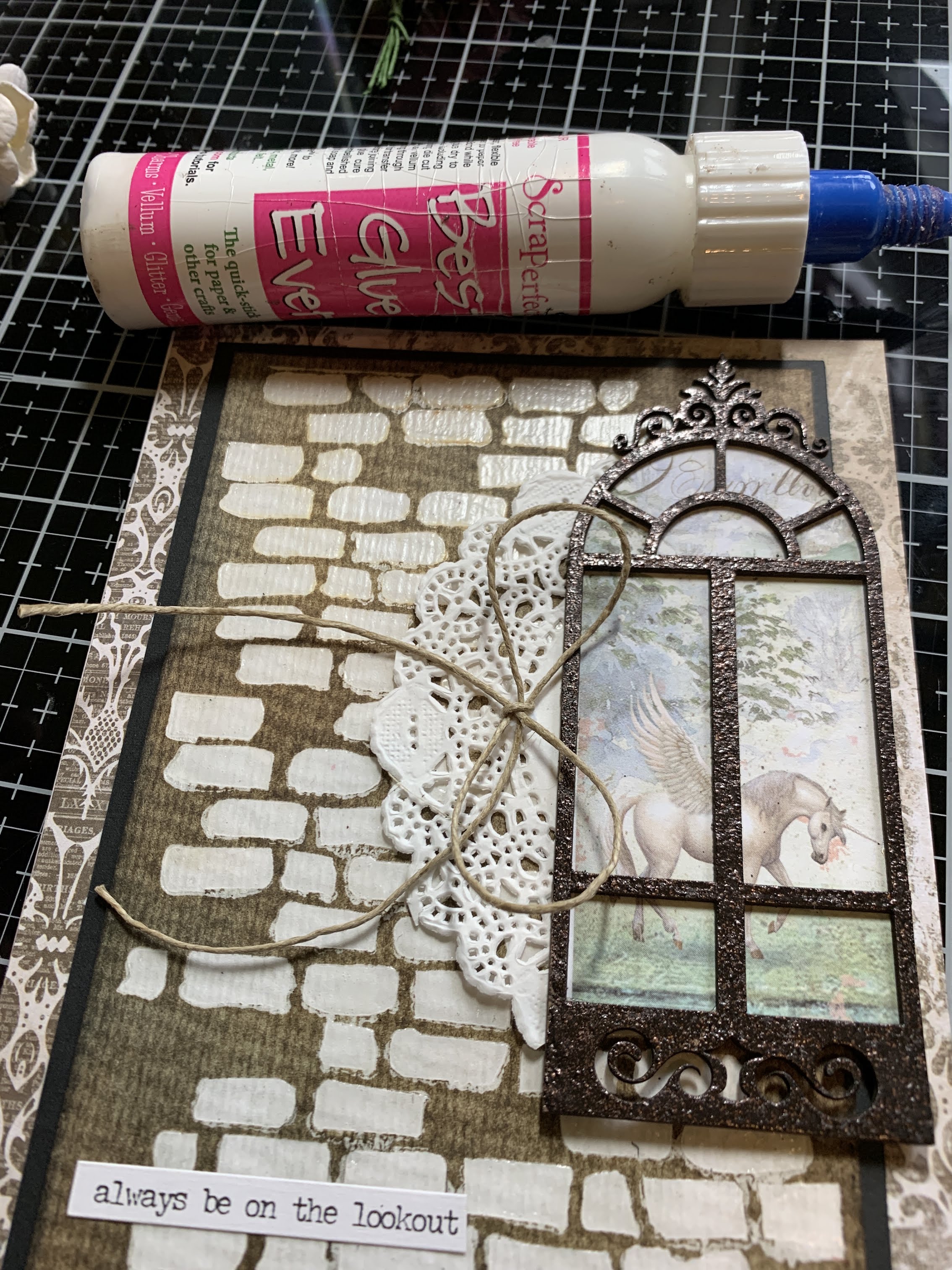 Watercolor paper, Patterned paper, Multi-media gloss, embossing powder, Distress inks, Embossing ink, Cardstock, adhesive, paper doily