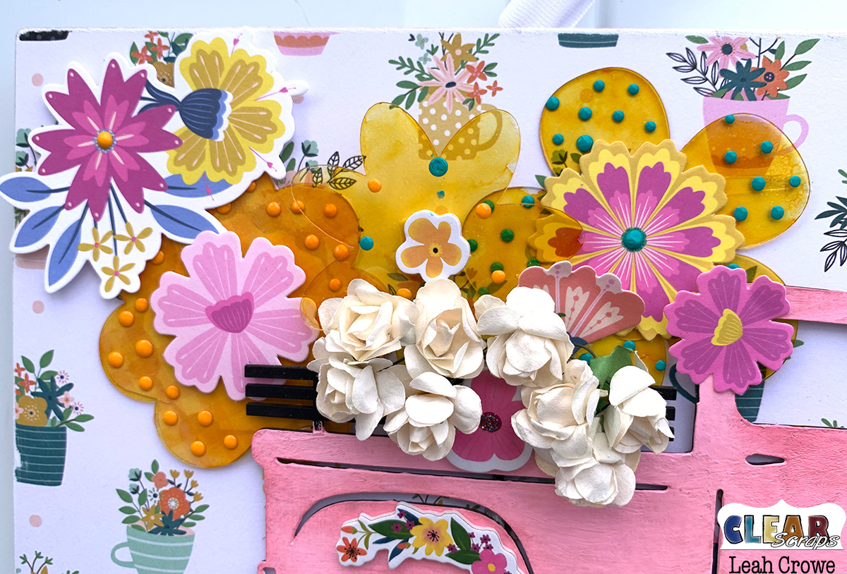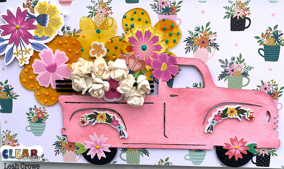 I ended up staining them with Alcohol ink and adding perfect pearls to create texture. I then just layered looooots of flowers behind the truck!