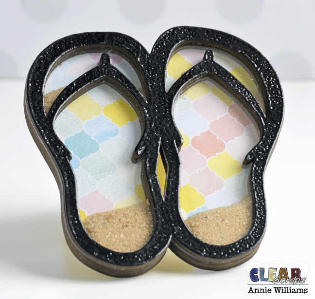 Of all the new shakers in the Clear Scraps shop, the little flip flops may be my favorite! First I traced the sandal shape onto some bright and summery scrapbook paper and then I cut it out and adhered it to the chip back shape with liquid glue. After adhering two more chip forms on top of the chip back with liquid glue, I added sand from one of my family's more recent beach trips and sealed the memories inside with the acrylic divider. To coat the top chip form in shiny black enamel, I applied Versamark ink and black embossing powder before melting it with my heat tool.