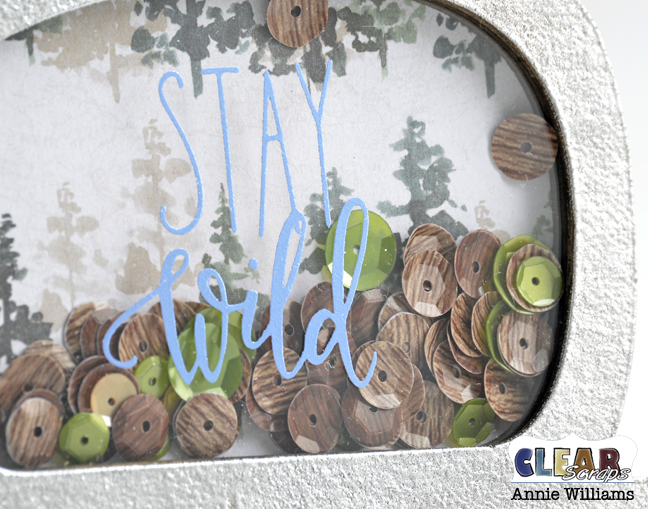 Additional products used: black and silver embossing powder, Versamark ink, heat tool, woodgrain/green sequins, beach sand, Beacon 3-in-1 glue, rub-on foiled sentiment, patterned paper, strong magnets