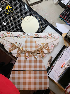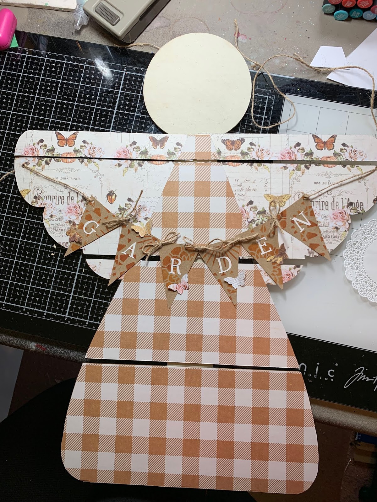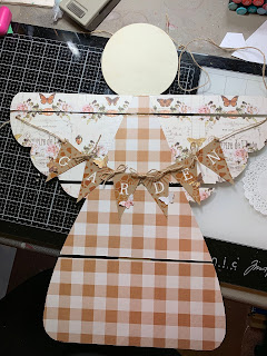 Once angel is "dressed" punch holes in each side of wings and hang banner. (hint I made the ties long enough to be used as the hanging tie as well.
