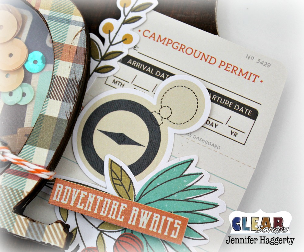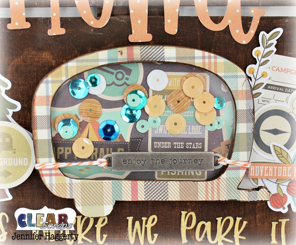 I assembled my Camper Mini Shaker Shape using patterned paper on the base and top frame chipboards. Each piece I used sand paper to trim away excess paper. From my stash, I selected coordinating sequins to place in the center of the shaker. I then added a thin coat of acrylic paint to the edges of the chipboard to give a finished look.