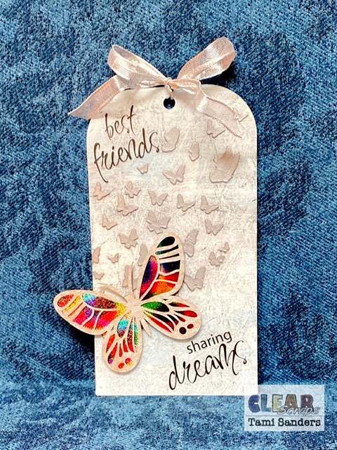 On the front of the tag, I used the Butterfly Stock Stencil with silver modeling paste; this combined with painting on the back of the tag, helps to add dimension.