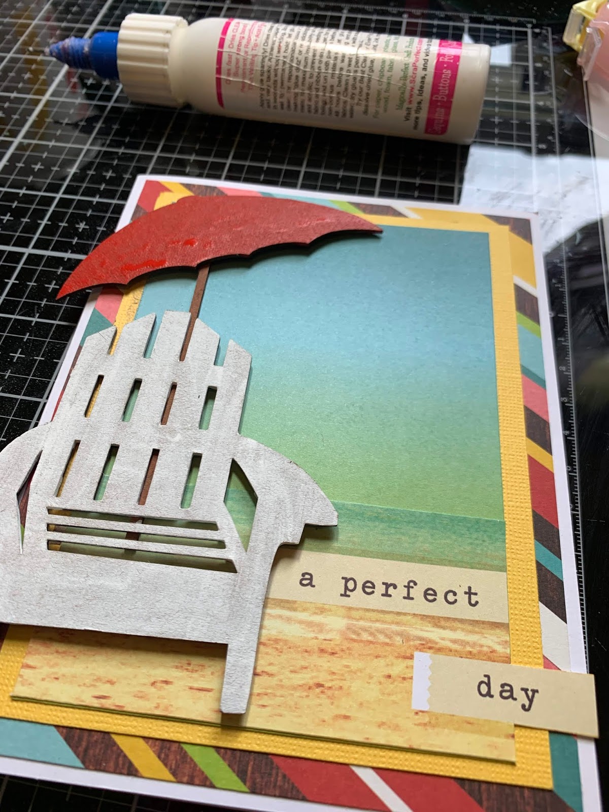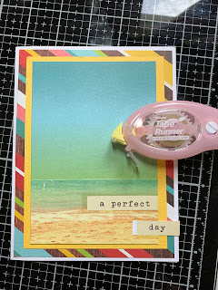 I chose Simple Stories Summer papers and coordinating card stock to create the back drop for my chipboard. All paper pieces were assembled with Tape Runner Adhesive.