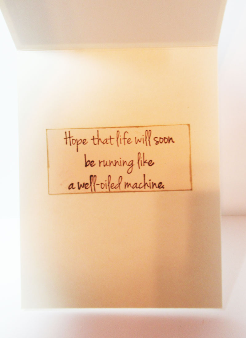 Card #2 uses the same gears stamp and a different sentiment. It was also added to the card with brads. The sentiment gives you a reason to look inside the card doesn't it?