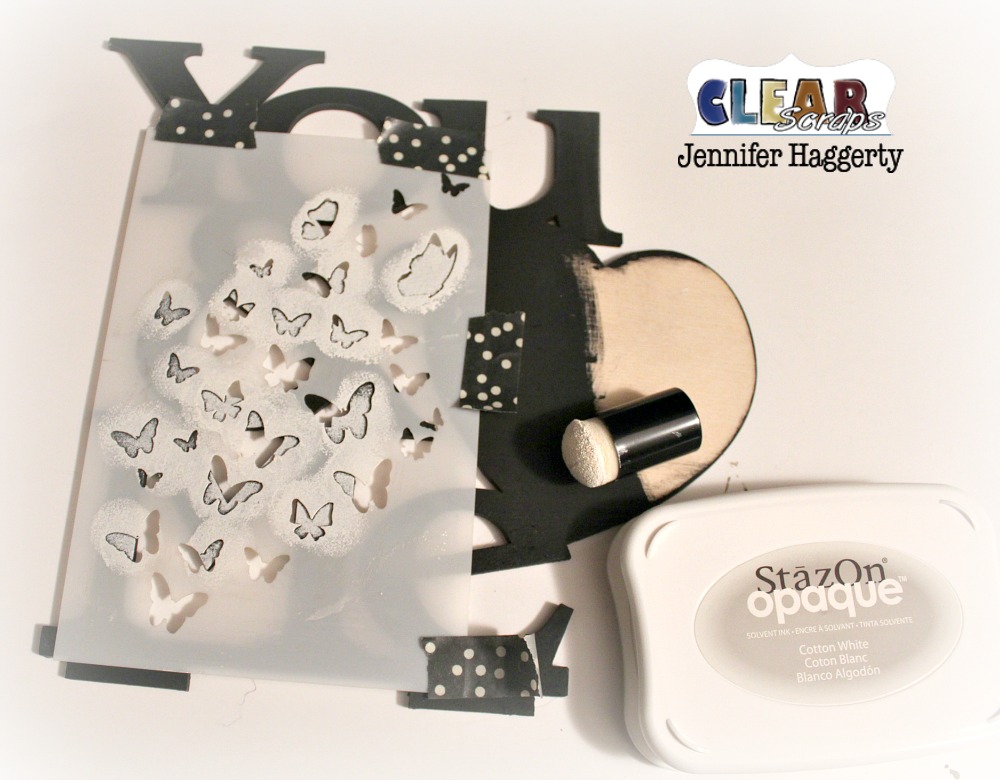 Next, using the 4×6 Butterfly Flock Stencil, I lightly daubed StazOn Opaque to the front of the word frame.