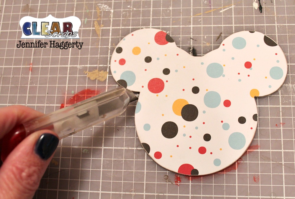 While allowing my paint to dry, I selected a background patterned paper to adhere to my chipboard base. I used my Beacon 3-in-1 Adhesive and then trimmed away excess paper with scissors. Using an x-acto knife and sanding tool helps to smooth out any rough edges.
