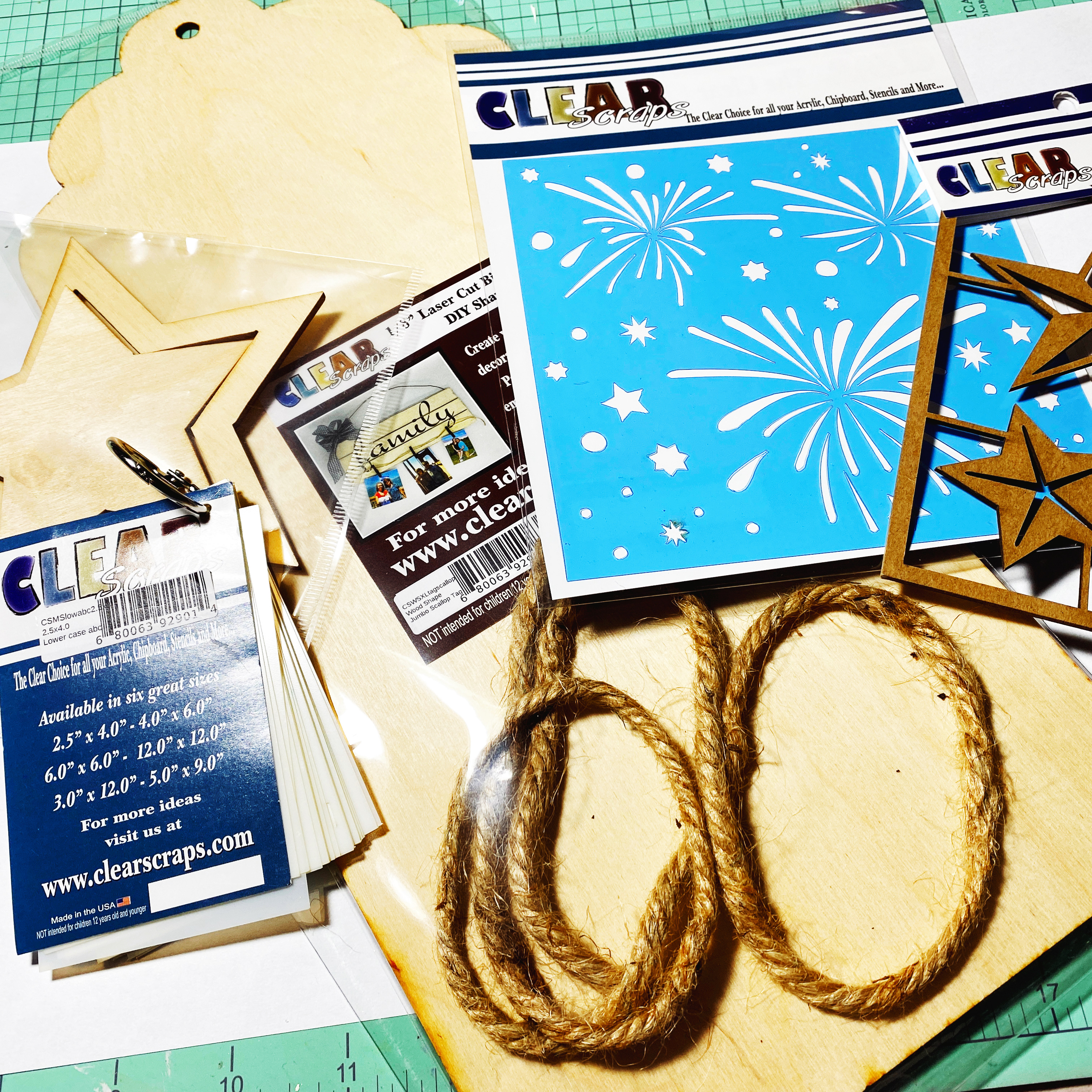 Clear Scraps: Scallop Jumbo Wood Tag, 6 X 6 Fireworks Splash Stencil, Lower Case ABC Stencils, Stars Chipboard Embellishment and 2 PC Wood Stars