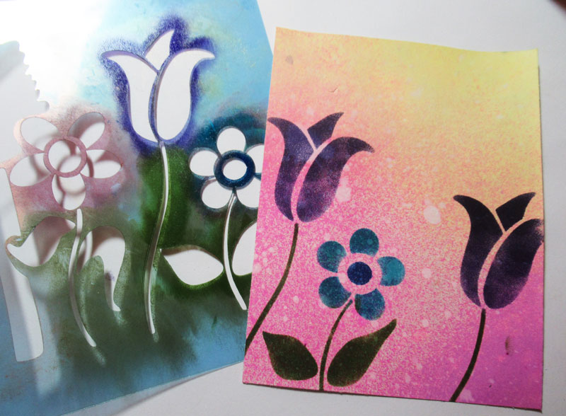 Using spritzed papers from my stash, I placed the 6" Post/Flowers Stencil on top, then used assorted inks to add color.