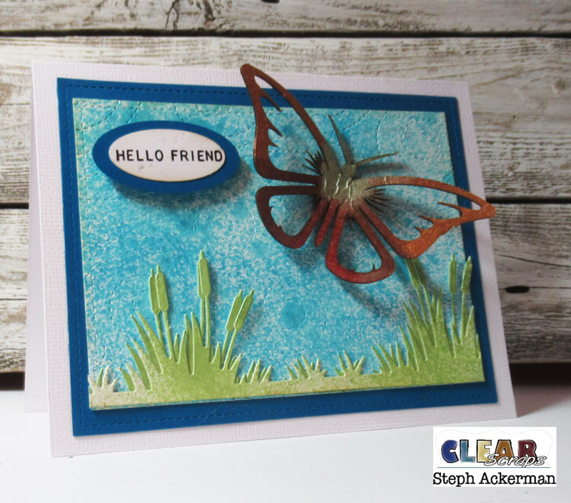 A double row of cattails was added to the bottom of the card. The panel was then matted with blue cardstock and added to the card. A stamped phrase was then added to the corner of the card with pop dots for dimension.