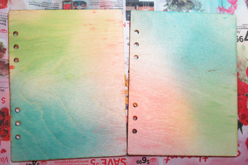 Use assorted colors of spray inks to add color to the covers. Use a paper towel, if necessary, to blend and blot the colors where they meet. You can be light handed, as I was, or heavy handed, depending on the look you are seeking. With a light effect, I love the wood grain that shows through the spray inks. Be sure to spritz both sides of the album covers so you can choose which sides you want for the exterior of the album.