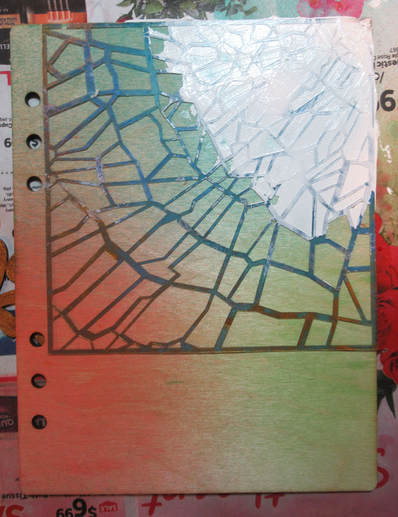 Place the 6" Shattered Glass Stencil on the corner of the front panel. Use modeling paste to create texture and dimension over a portion of the stencil.