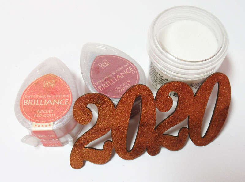 Ink the 2020 Chipboard Word Title with 2 coordinating colors of ink and emboss with clear embossing powder. This adds a little bit of shine to the chipboard word title.