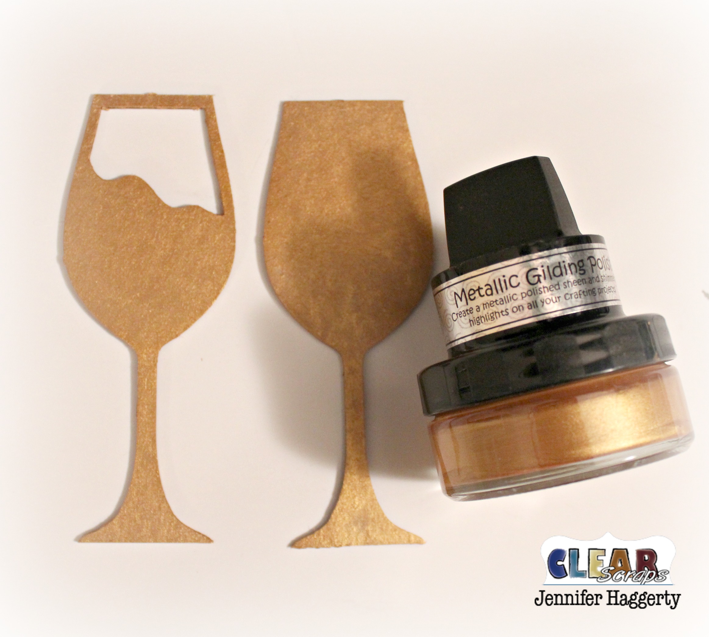 Next, I clipped the Wine Glasses Chipboard Embellishment Shapes from the frame and colored each with Metallic Gold Gilding Polish. The chipboard accepts the paste quite well and the more you burnish, the shinier your end result.
