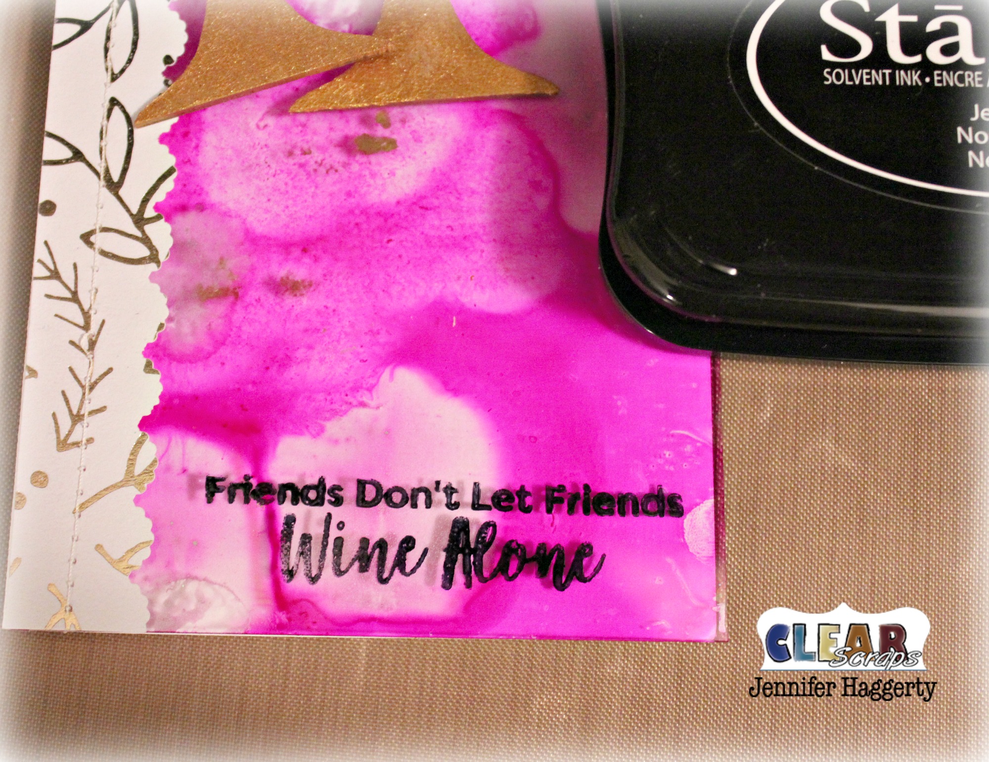 Using StazOn Ink in black, I stamped a sentiment at the bottom of my card (note: this is the opposite side of where I applied the alcohol ink).