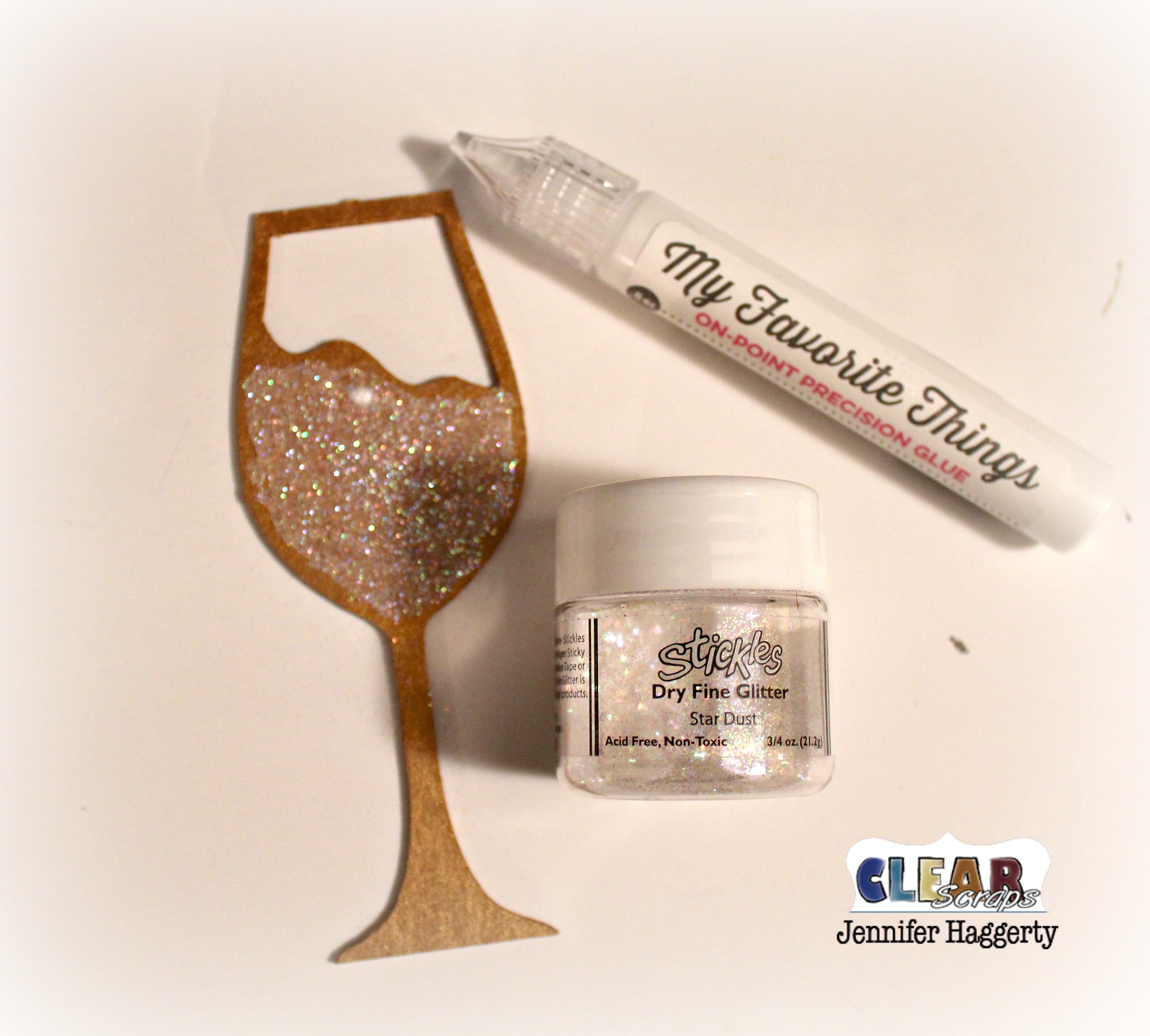 I then used adhesive to apply dry glitter to the "wine" portion of the chipboard. After allowing to dry, I added some rainbow colored beads to the glitter to simulate bubbles.