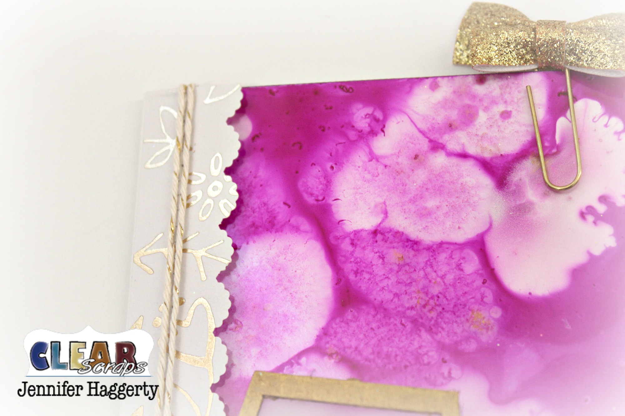 Slim cards are the hot trend right now so I wanted to create one using a 12×12 Acrylic Sheet. I cut a piece of cardstock 1/2 x 8.5 inches scoring to create a flap for my acrylic. I cut the acrylic sheet to 3.25 x 8.5 inches. I then selected alcohol ink in purple and applied with an applicator to the front of the acrylic sheet. I then dropped gold and silver mixatives onto the surface and allowed to dry.