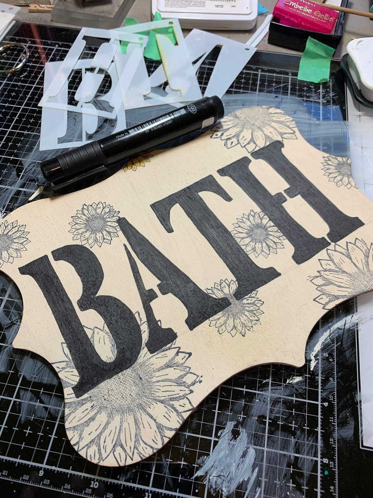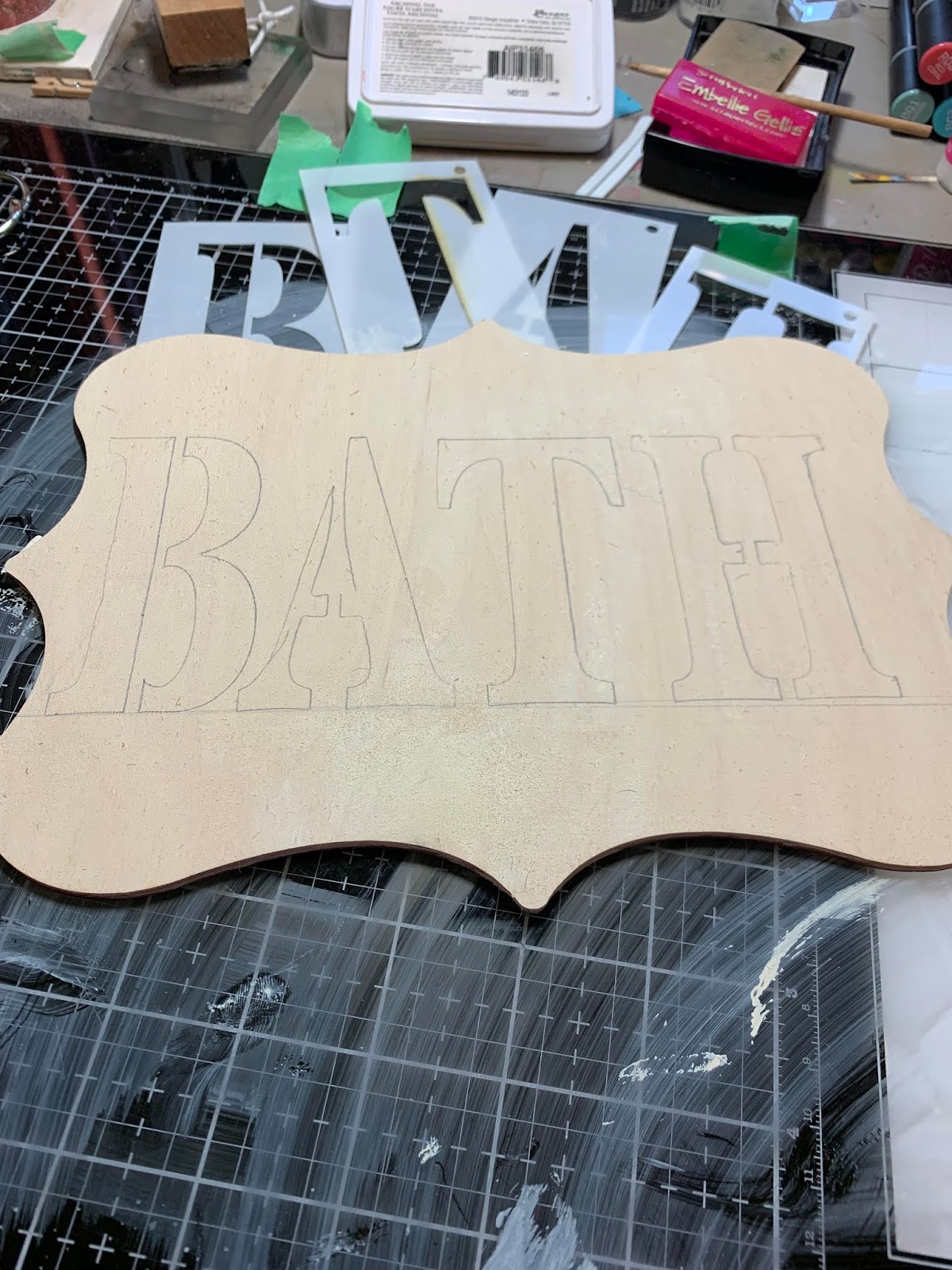 Using ABC Capital Letter Stencils from Clear Scraps, trace your BATH onto pallet.