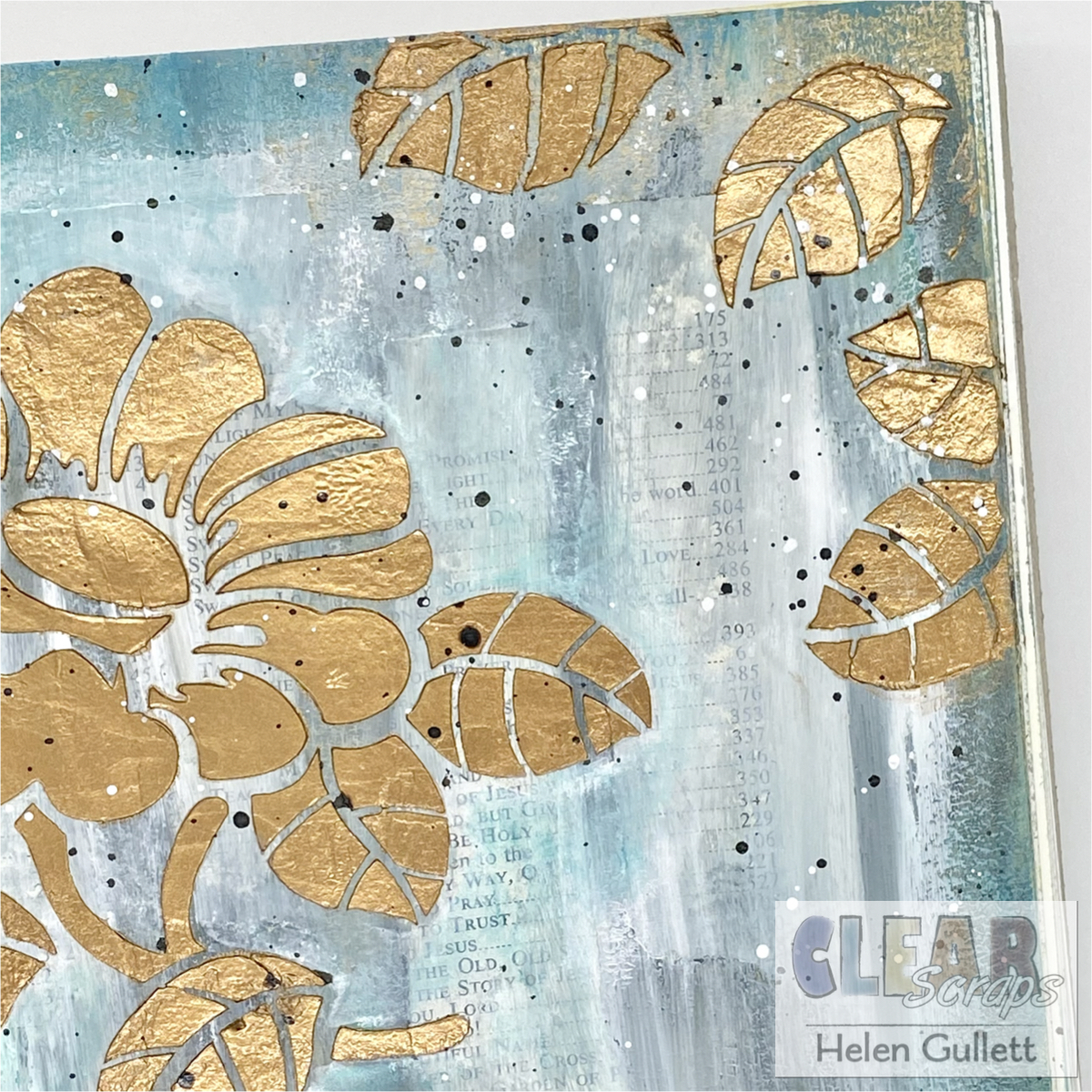 After I dried all the inked letters, I added more flowers and leaves around the page using the 6" Zinnia Stencil and Aged Copper Metallix Gel.