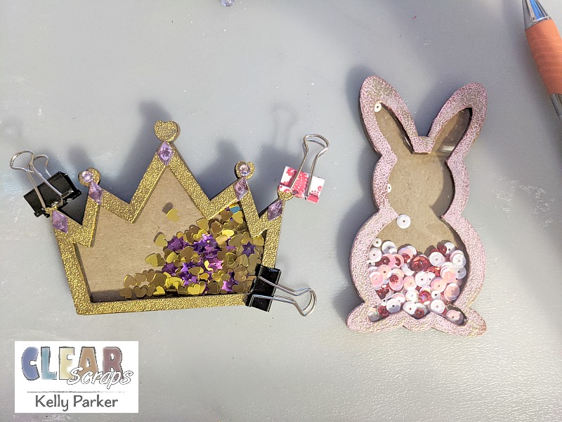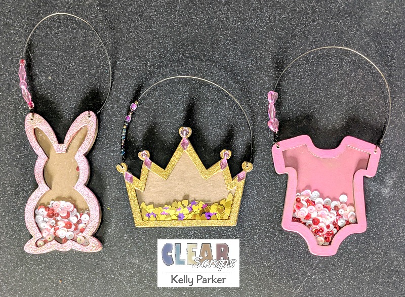 A bit about the process, the front piece was embossed on the crown with gold embossing powder, and the bunny was embossed with first raspberry then gold embossing powder. I thought that it was too much on the bunny so I painted over it with some light pink acrylic paint and wiped it back. I then drilled holes in the tops of each shaker and added a wire hanger with matching beads. The onesie was painted with pink paint.