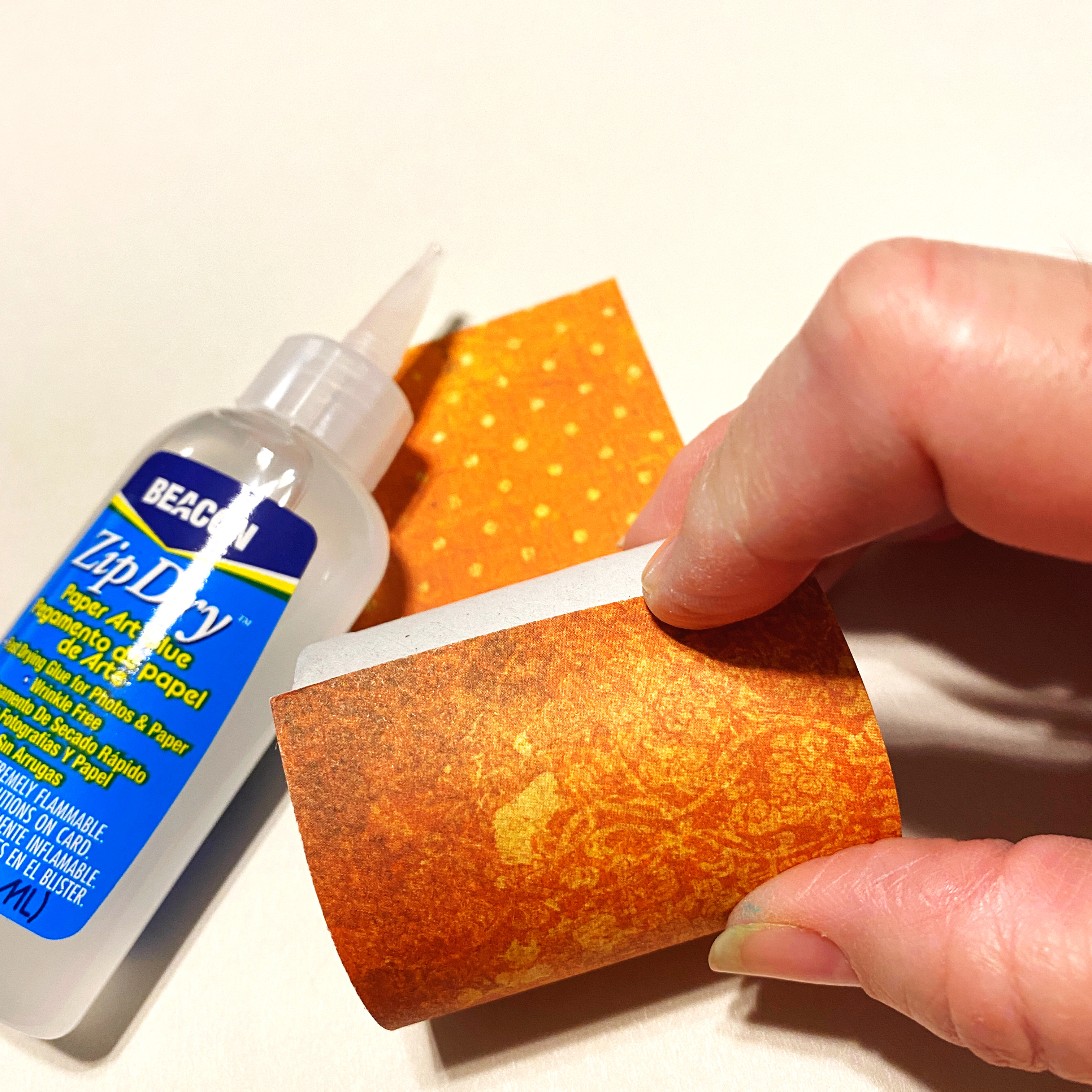 A piece cut from a cardboard tube was covered with printed paper and adhered to the back of the leaf to form the ring.
