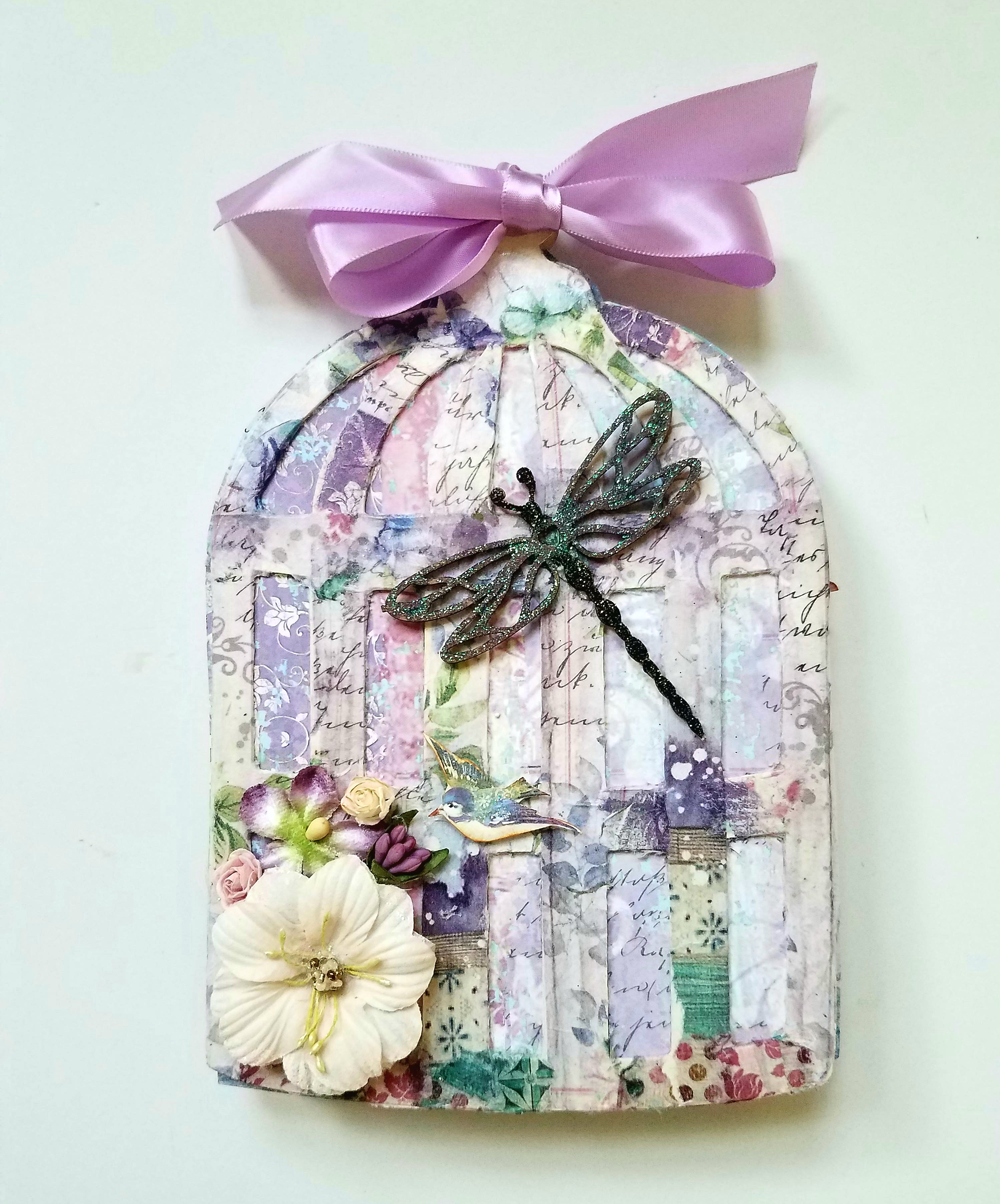 Now to decorate the cover, I glued my Dragonfly chipboard towards the top of my album. Added some Prima flowers to the bottom left hand corner and tucked in a few roses in between. I fuzzycur the little bird from one of the papers. Inked the edges and used pop dots to adhere to my album. I tied a purple satin bow through all the pages to attach them together.