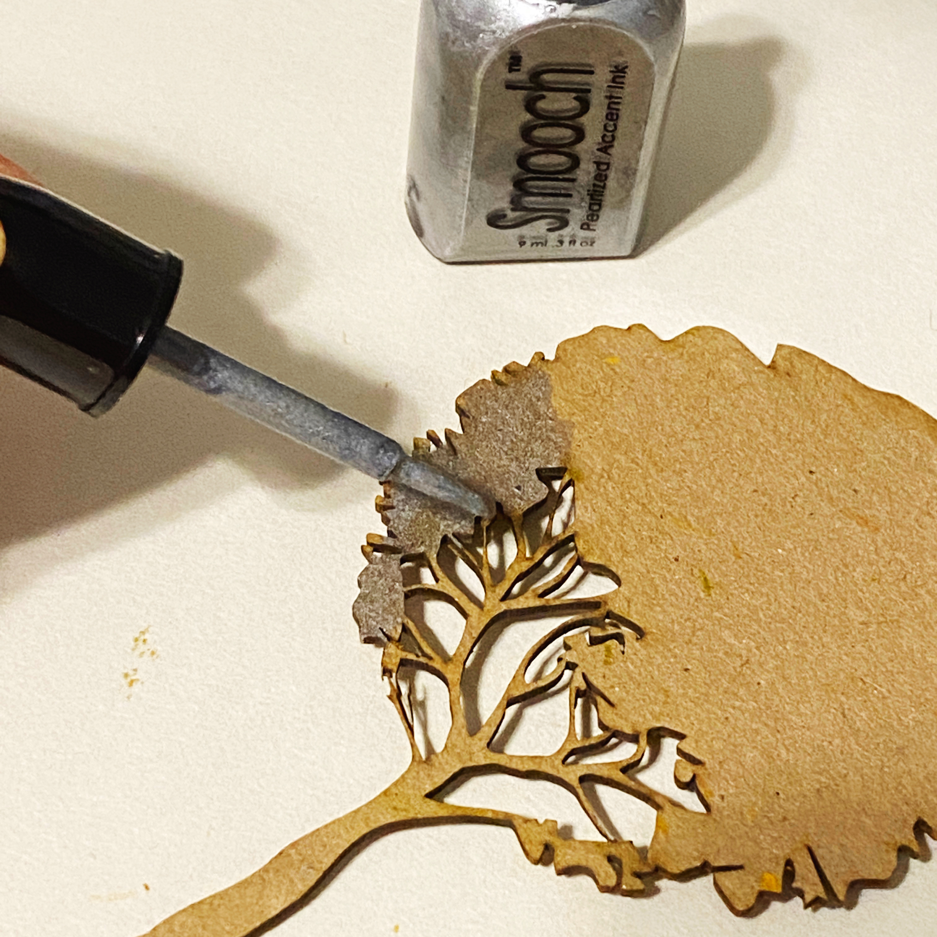 Next I colored the leafy portions of the trees with pearlized inks; I did one in silver and one in gold…