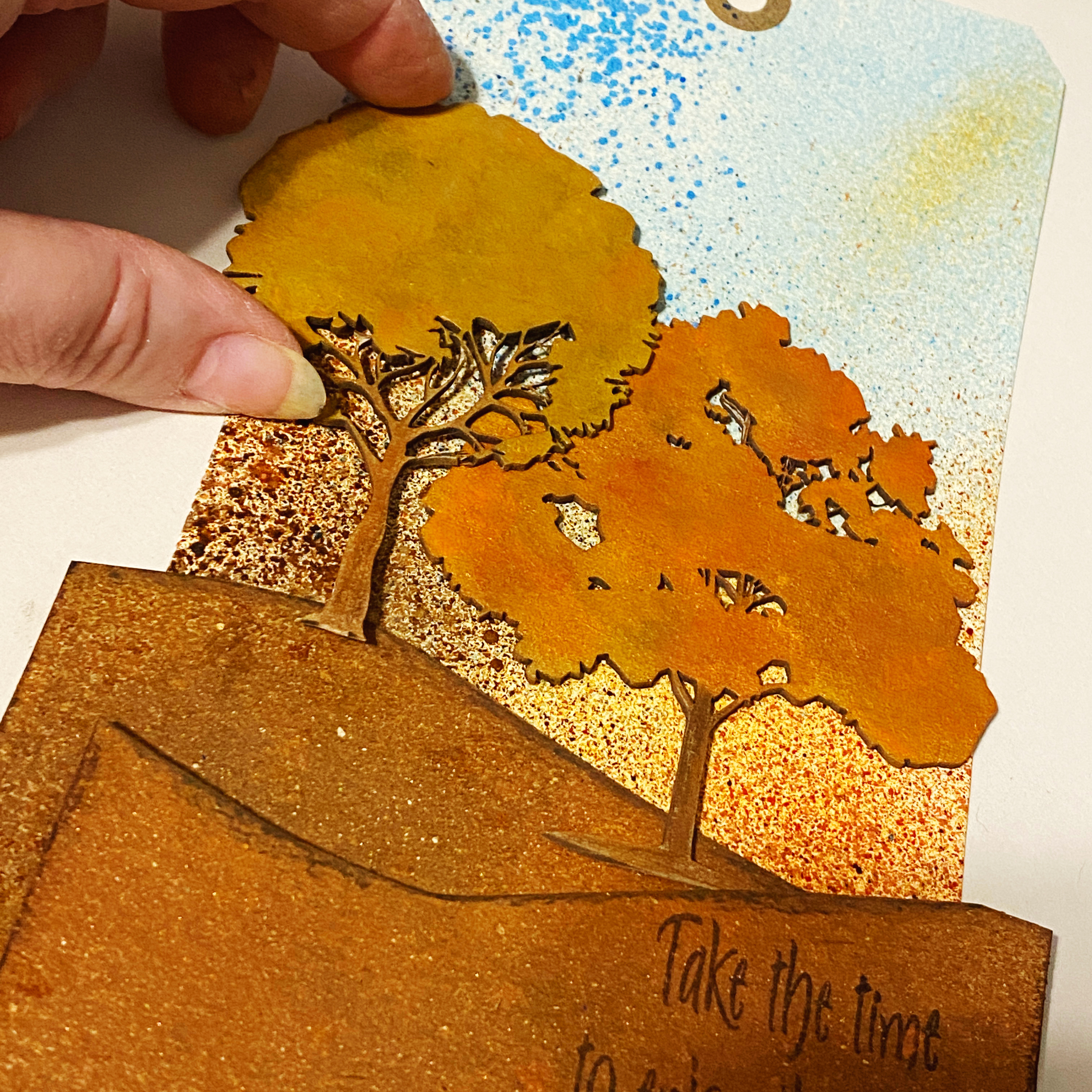 then the elements were assembled on the tag using foam tape to add dimension to the top hill and left tree…