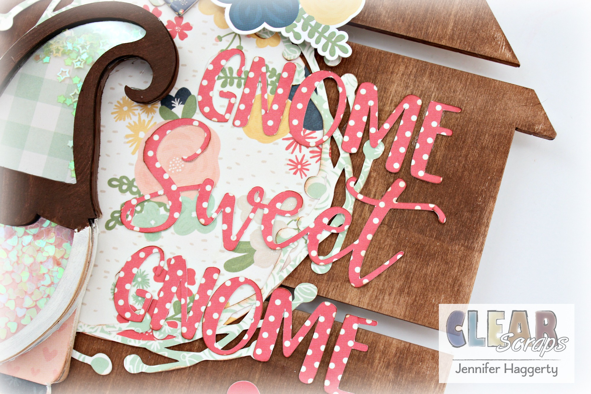 Using my Silhouette, I used coordinating prints to cut a wreath as well as my title "Gnome Sweet Gnome". Again, I adhered all using my Beacon Adhesive.