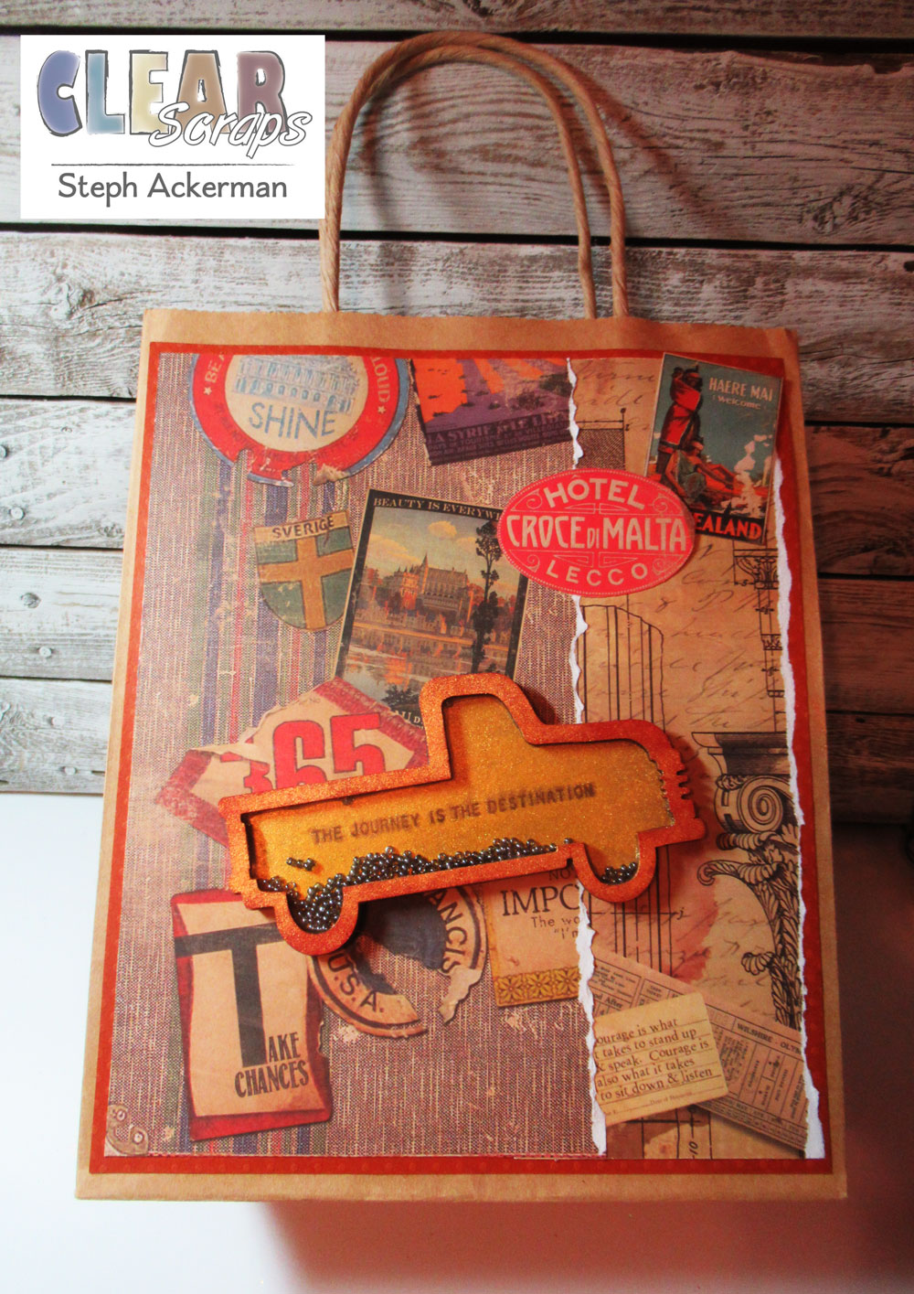 Using travel papers, I decorated the front of a gift bag. Then I placed the truck slightly off center.