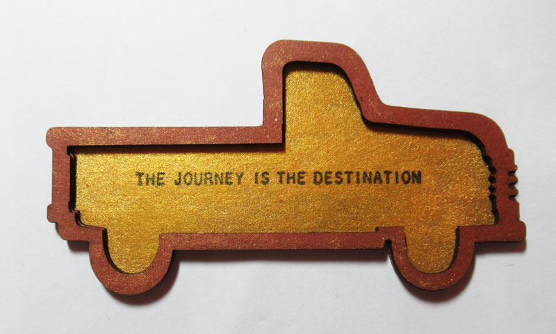 Gluing 2 of the die cut trucks to the base, I stamped a phrase inside.