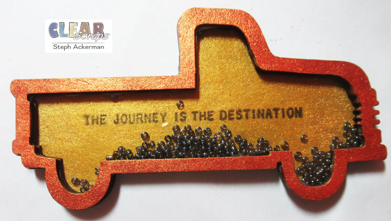 Placing mini beads in the cavity, I then glued the acrylic panel (remember to remove the film on both sides of the panel) and the last die cut truck in place. I placed a heavy book on top and let it sit overnight before continuing with my project.