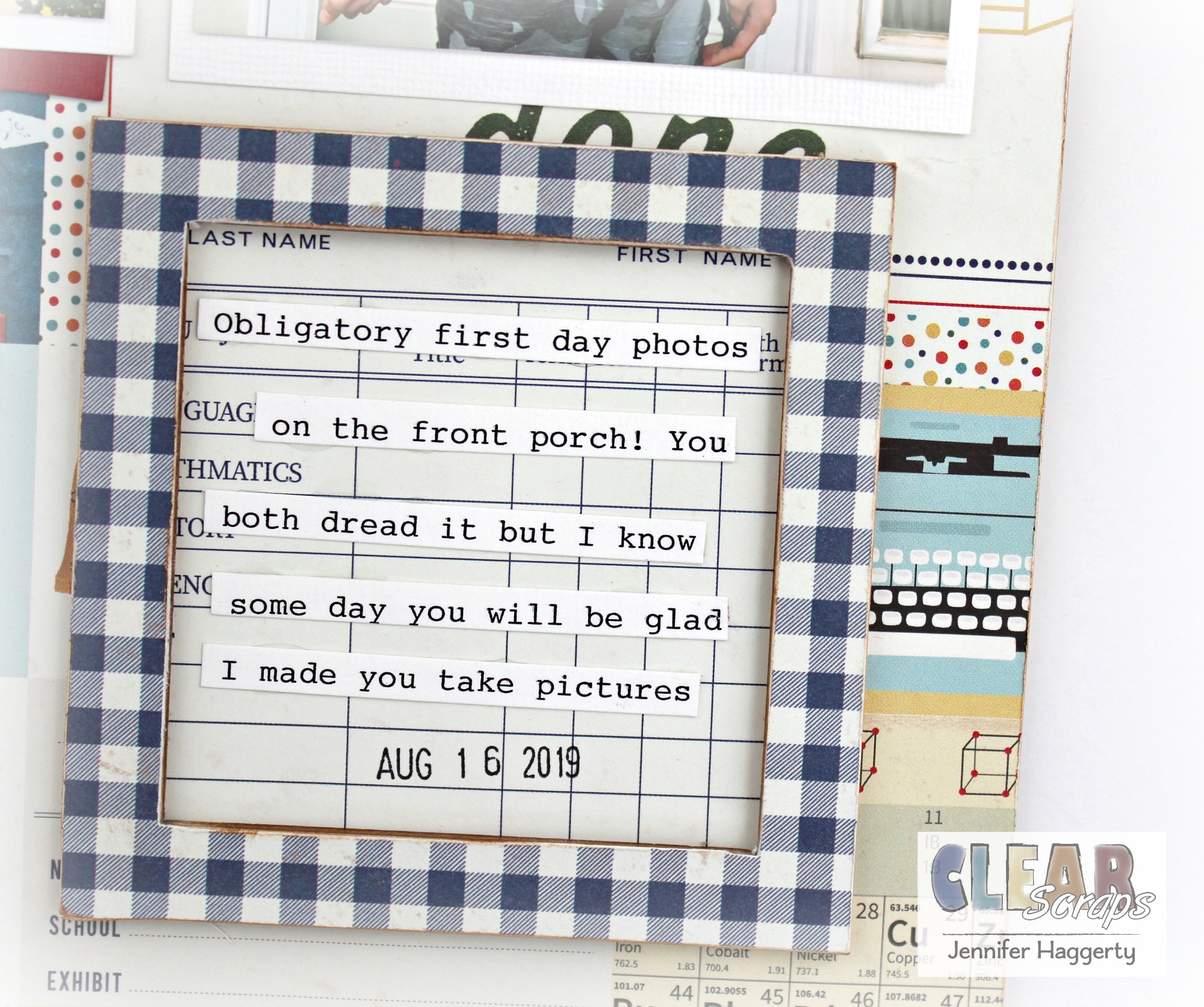 I utilized the Wood Square to hold my journaling which I typed on my electric typewriter and white cardstock. I also added a stamped date at the bottom. The entire piece was adhered with my Beacon 3-in-1.