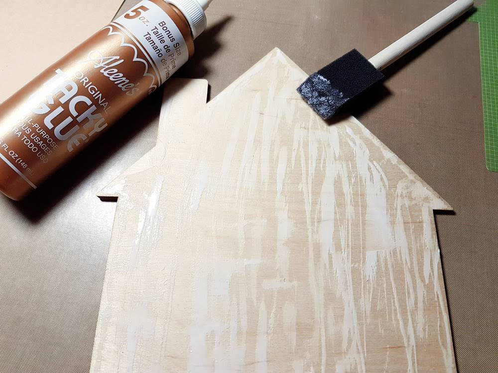 Then I applied some tacky glue on the wood and used foam brush to blend it. (Remember to wash and clean the brush right after use!)