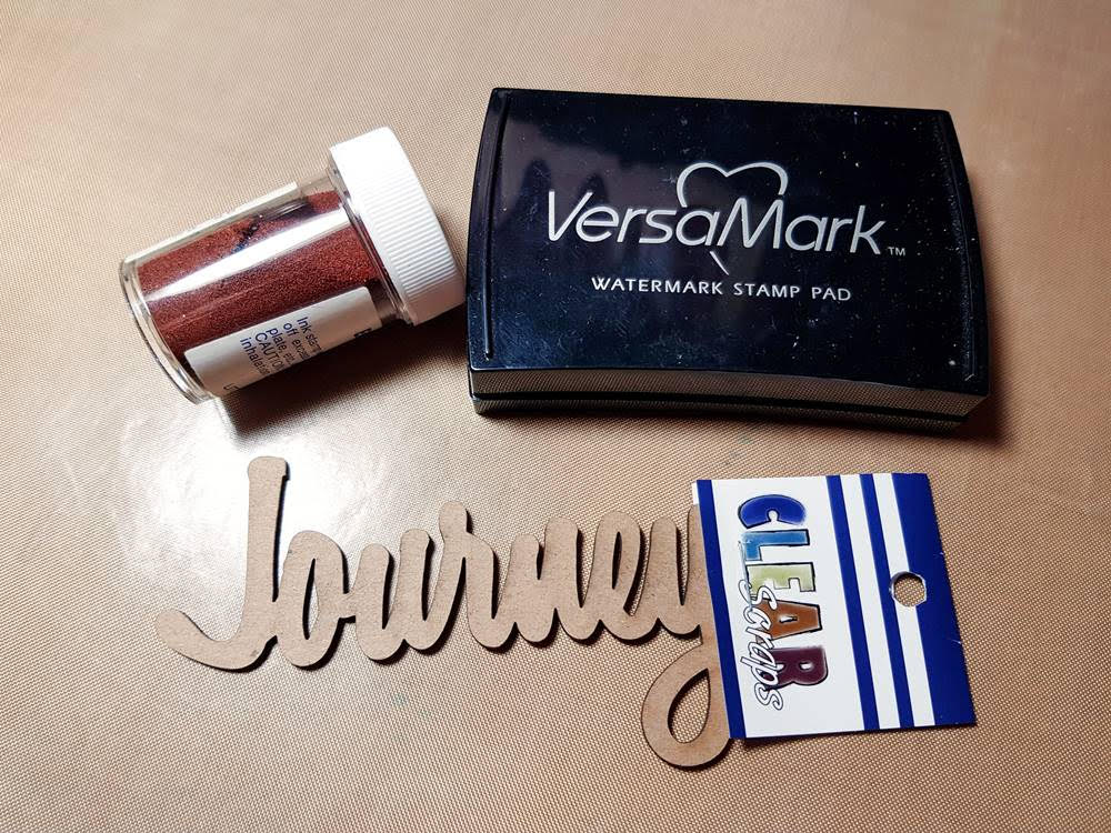 For the journey chipboard, I decided to give it a coat of embossing powder with brown color. I tapped the chipboard on the Versamark ink pad, then applied embossing powder and heated with a heat gun.