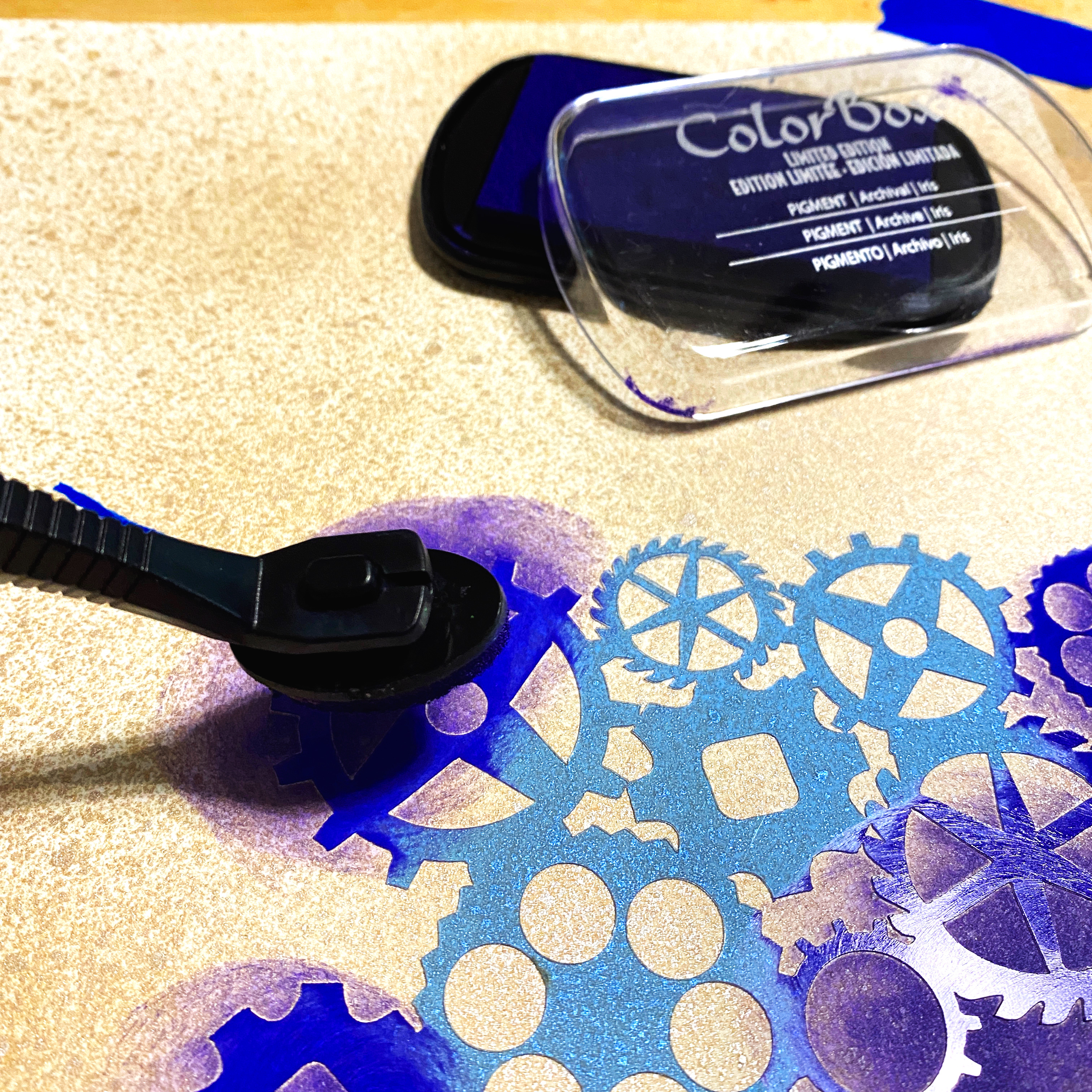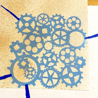 Then I taped the Gears Stencil over the spritzed cardstock…