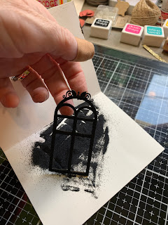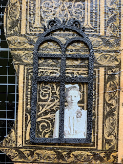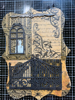 Cover Clear Scraps Mixed Fancy Windows Chipboard Embellishments with embossing ink and Wrought Iron Embossing powder and heat emboss.