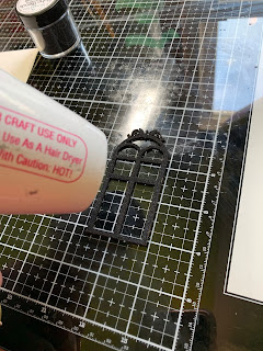 Heat emboss Clear Scraps Fancy Gate Chipboard Embellishments and add to bottom of project base.