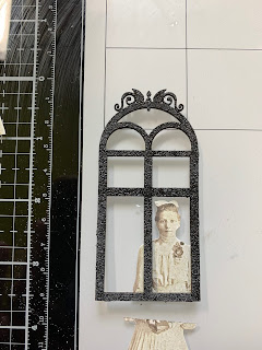 Trim paper doll image to fit in window and adhere to your project base.