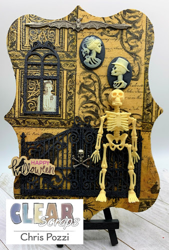 Today I am excited to shared this mixed media project I created using some of my favorite Clear Scraps Supplies. I literally grabbed lots of different Halloween scrap embellishments to add to this project!