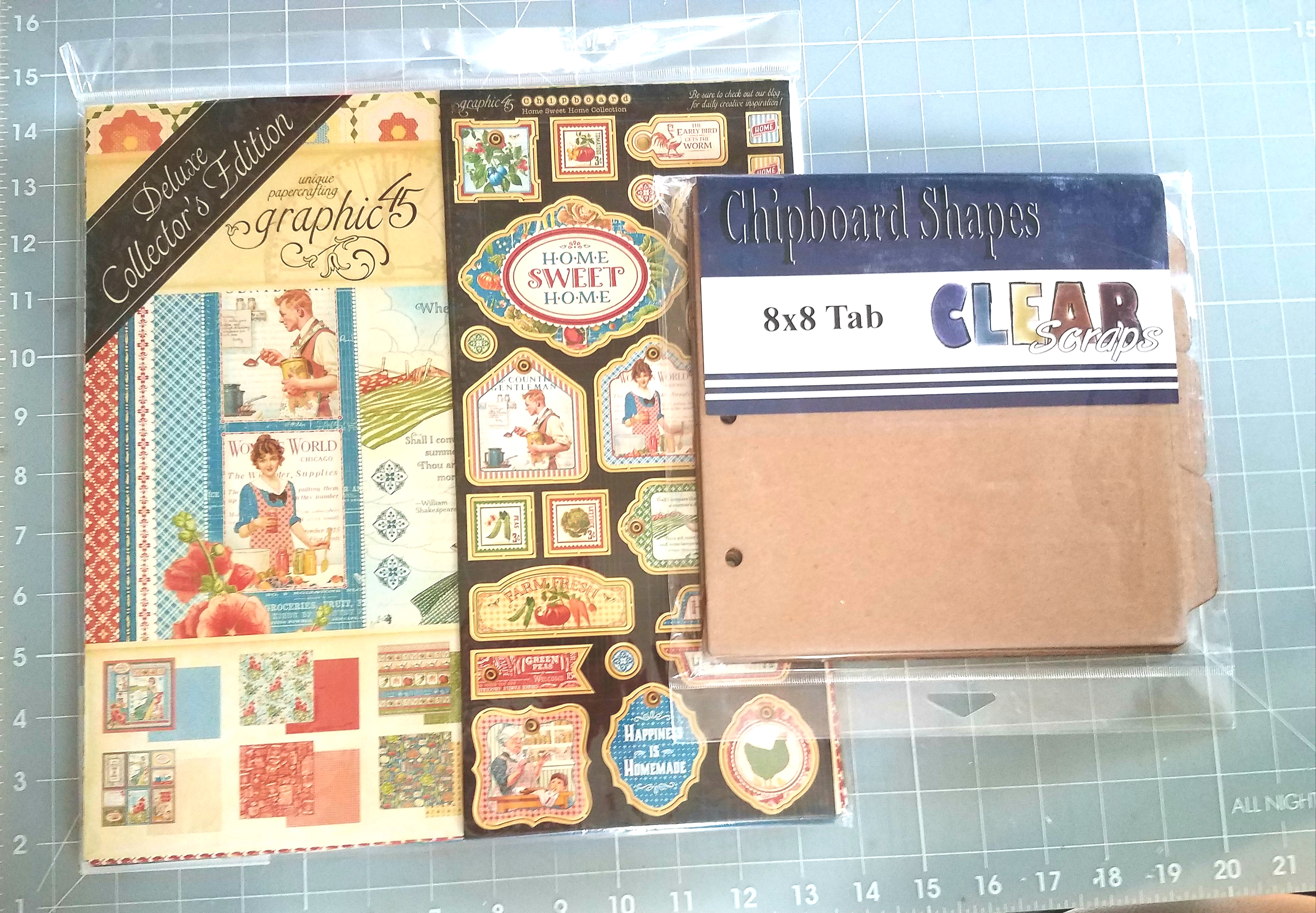 Clear Scraps 8×8 Tabbed Album, Graphic 45 "Home Sweet Home " collection pack, Stickles glitter, Distress Ink, Beacon 3-in-1 Glue, Metal rings, assorted ribbons, Foam Dots