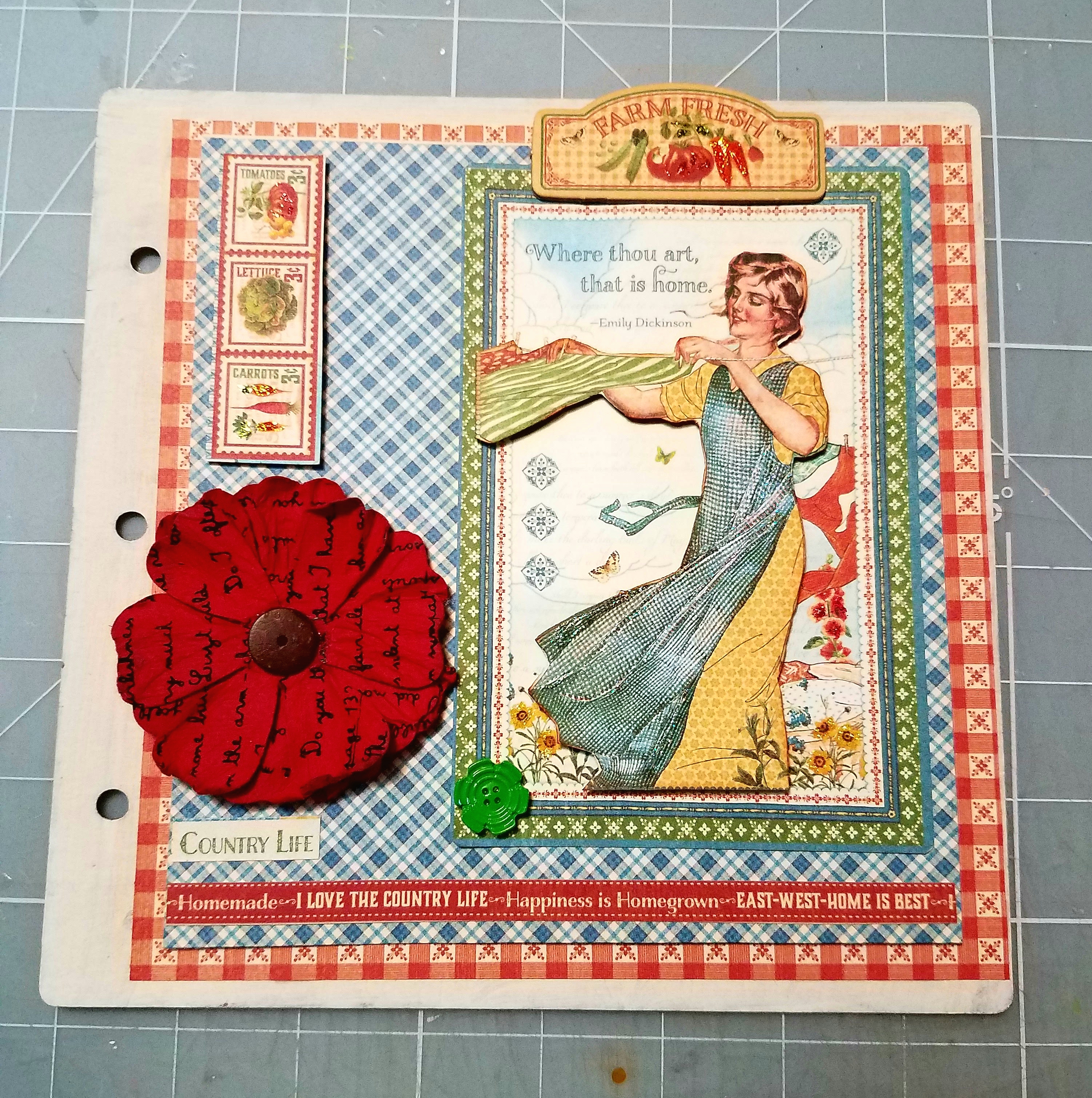 Now you can start decorating the front cover of you album. I cut another patterned paper to 61/2 x 7 inches added some foam dots to the back of the paper. Then adhere on top of your base of your front cover. I chose one of journaling cards and adhered to the right side of my front cover. I added one of the chipboard stickers "Farm fresh " on the top part of my album. Fussy cut out a few of the vegetable stamps, and adhered to the left side of my album using foam dots. I also fuzzy cut another image of the vintage gal, inked the edges with Distress Ink and used foam dots to adhere her on top of the same image on the journaling card. I like to add touches of glitter to the vintage gal apron, farm fresh chipboard sign and on some of the vegetable stamps. To finish the cover, I glued a vintage button on one of the corners of the journaling card. And glued a paper flower on the left side.