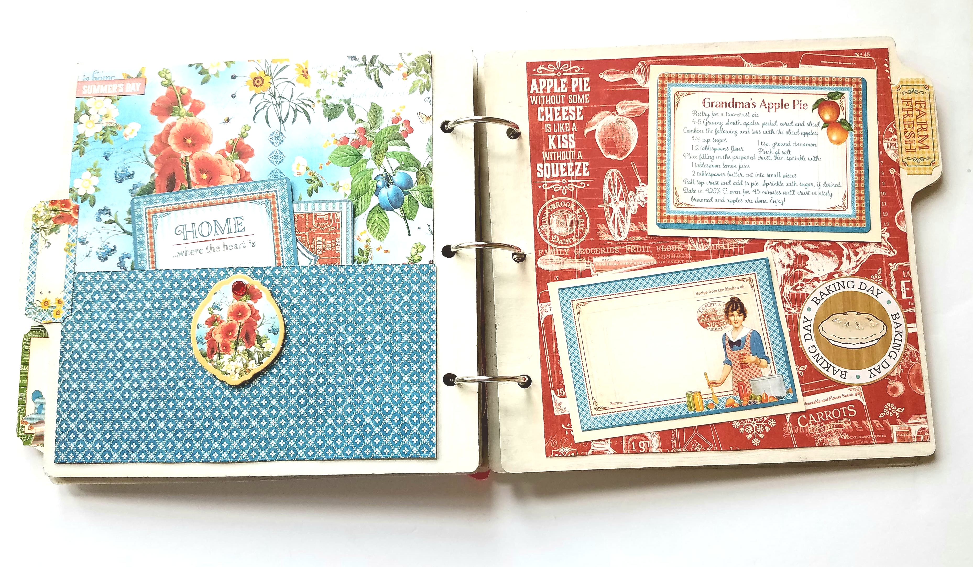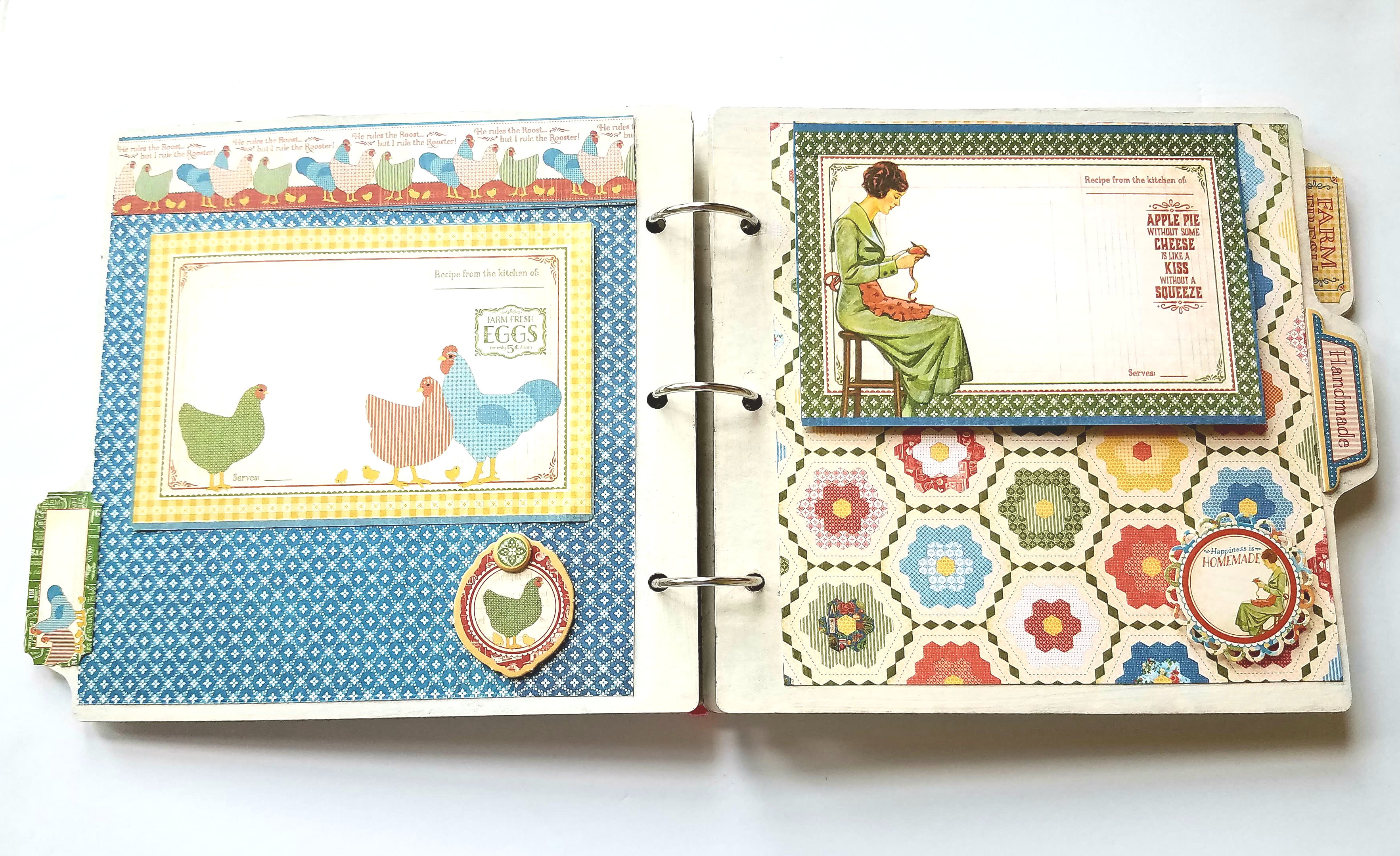 The next two pages I used some larger recipe cards and a few chipboards and stickers to decorate my pages. The recipe card on the right page, I scored 1/2 inch at the top and adhered as a flap.