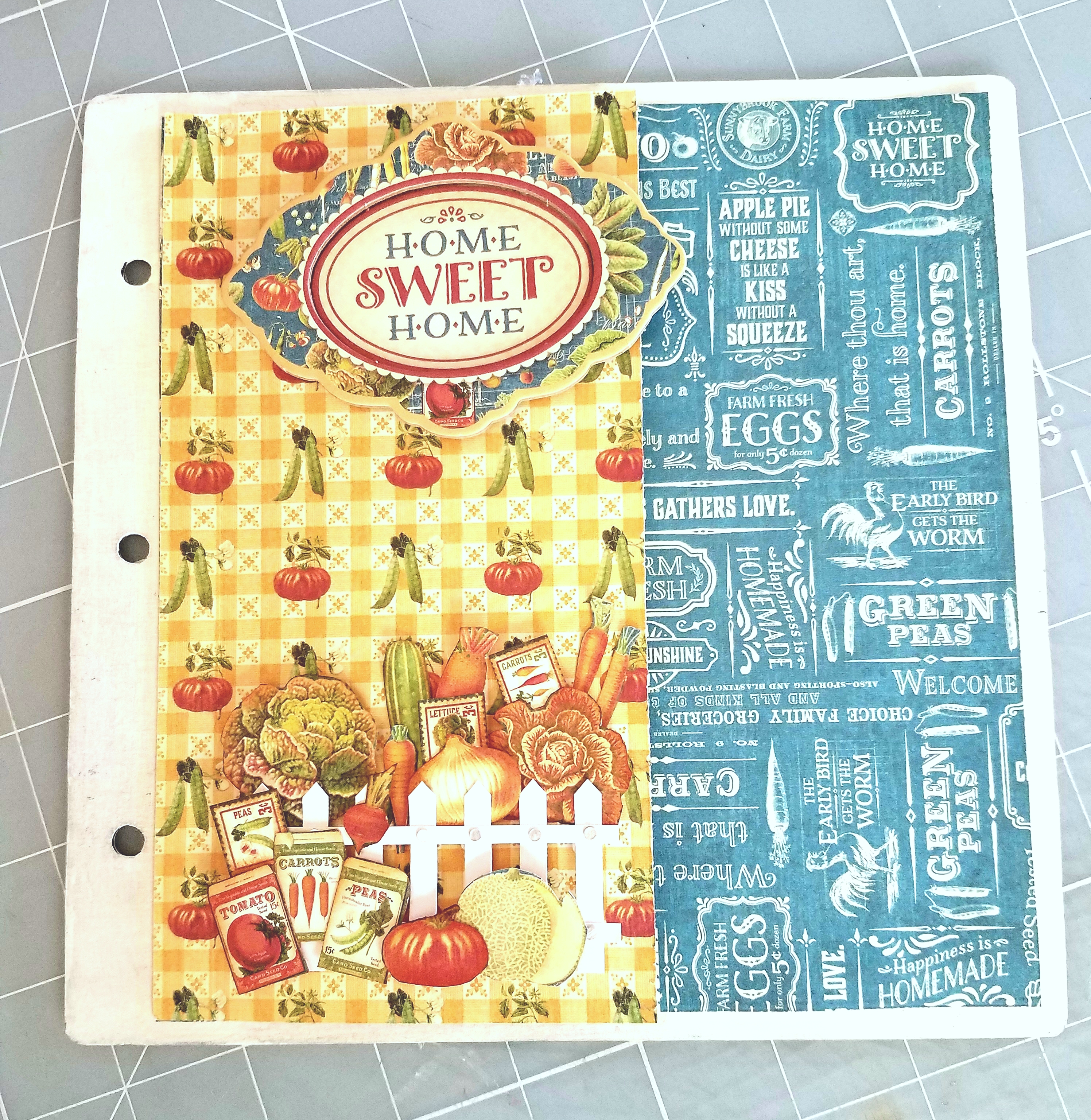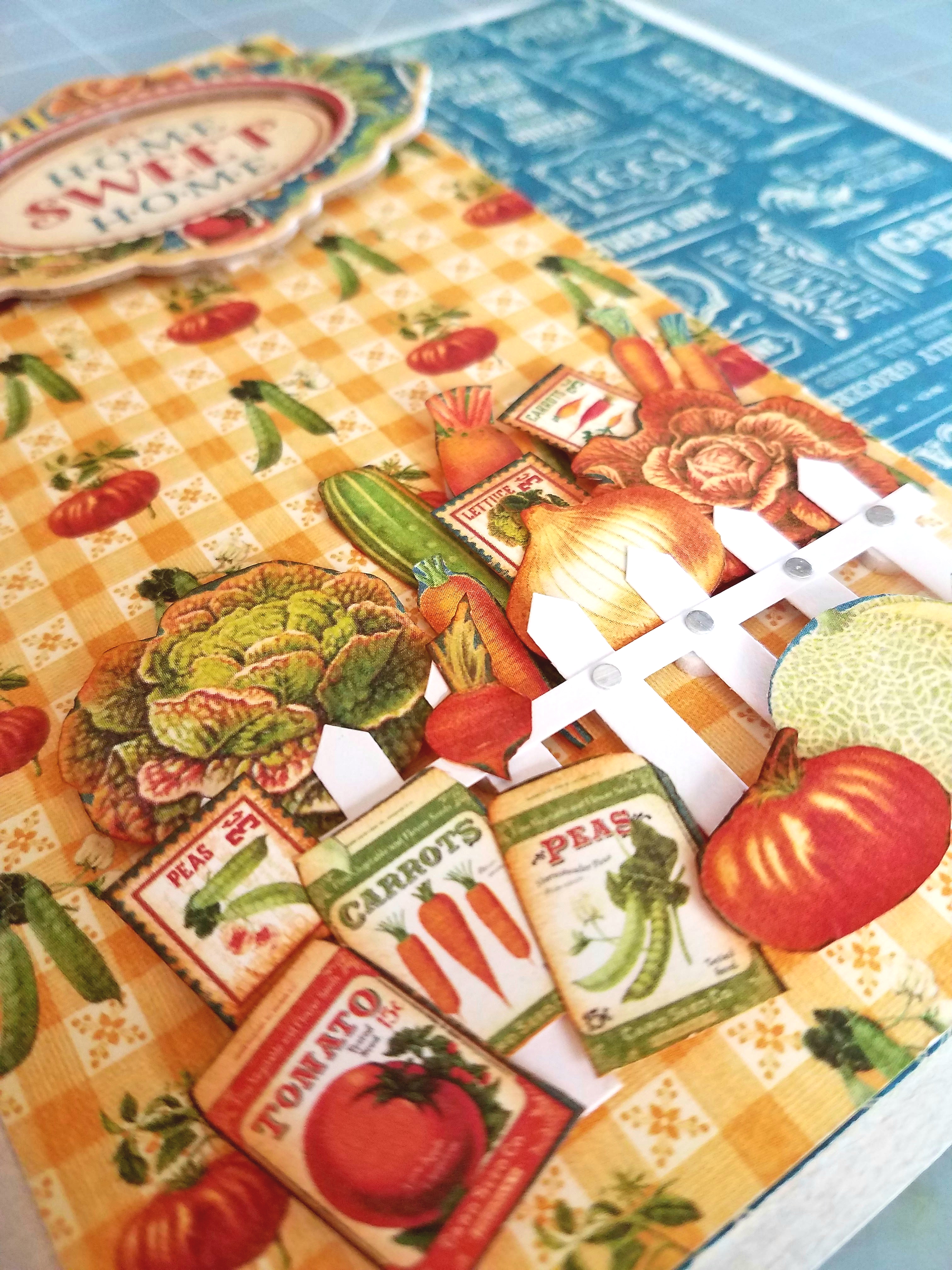 For the last page on the right side, I cut down the tomatoe paper to 4 x 71/2 inches. Scored 1/2 on the left side to create a side flip page. I added foam dots to the vegetable frame and adhered this on the flip page, make sure you don't glue over the scored part of the flip page. Then I glued the "Home Sweet Home" chipboard piece in the middle of the frame. To finish my page I cut down a piece of white picket fence sticker, added some small foam dots to the back of the fence. Adhere this towards the bottom of your flip page. I fuzzy cut out some vegetables and vegetable seed packets, inked the edges and adhered some on the fence, some I tucked behind fence with foam dots.
