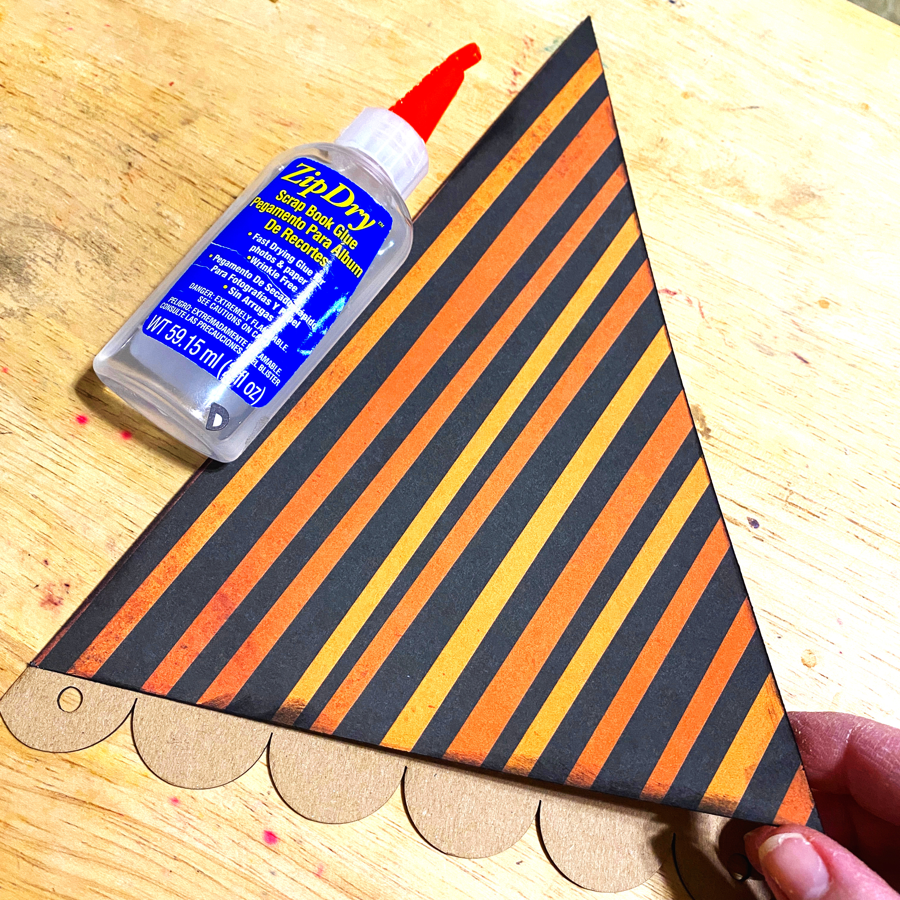 I had some trim I found at the dollar store that I thought would look great as the brim of the hat, so I cut a piece the length of the scalloped portion of the chipboard banner piece and adhered it…